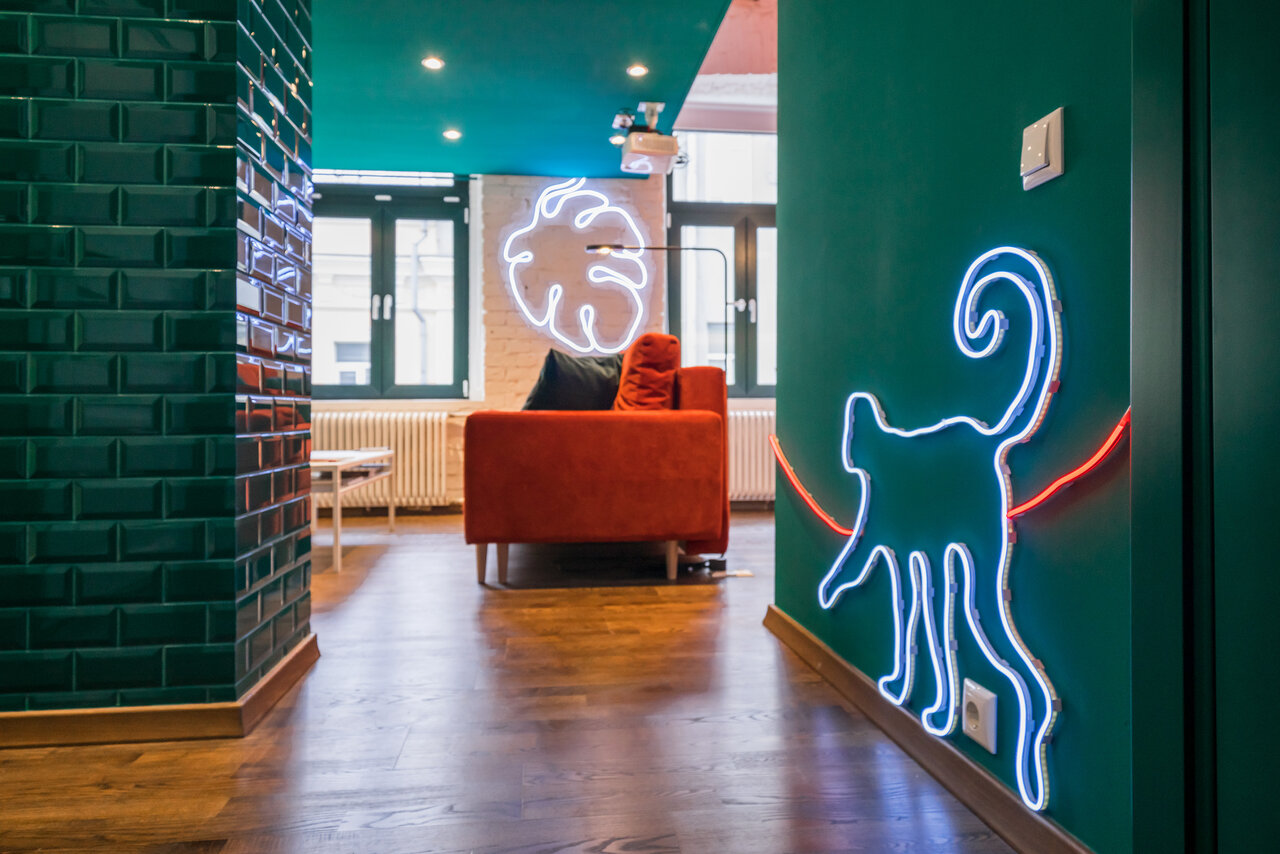 Очень красиво и стильно, но звукоизоляция кошмарная — деревянные двери в апартаменты со щелью у пола >_< все вечеринки у соседей - ваши вечеринки.