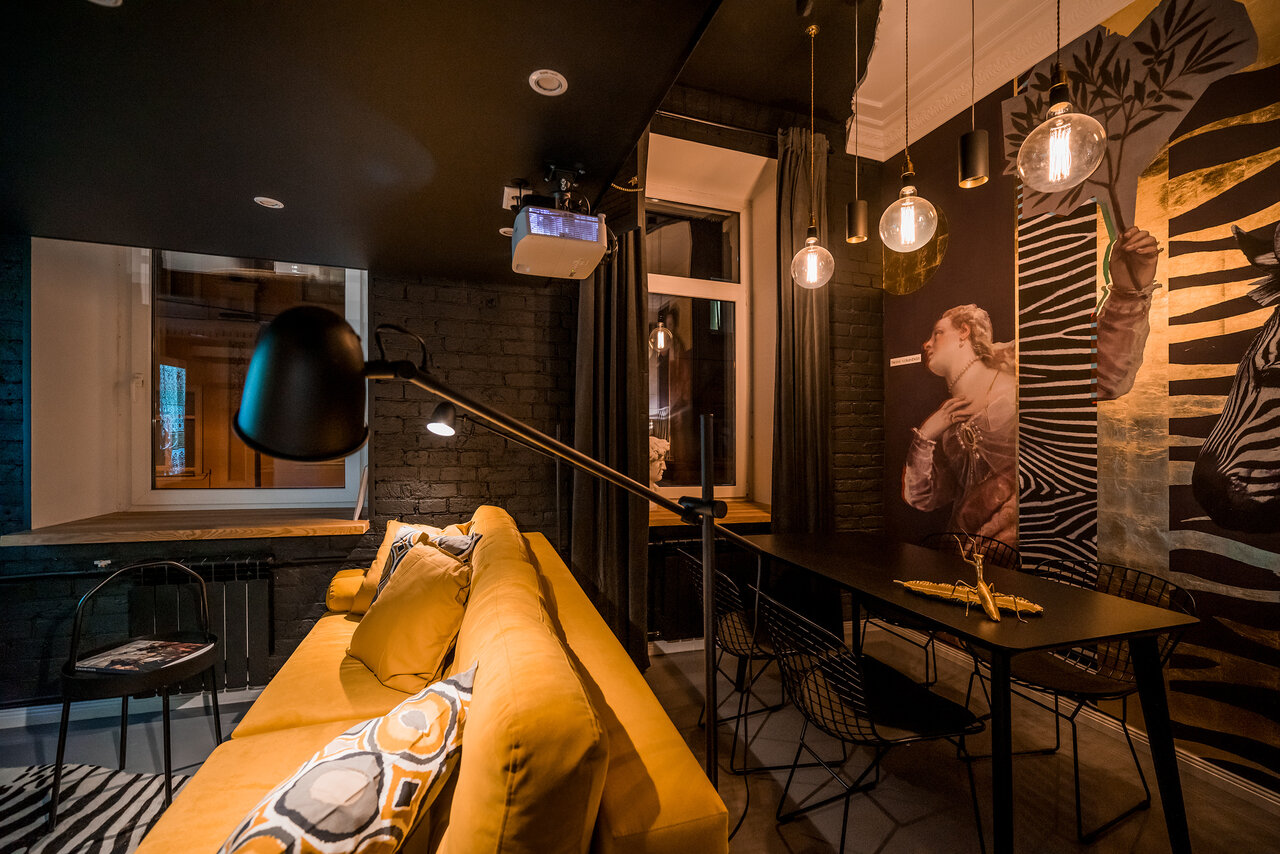 Были в апартаментах Джаз. Плюсы: Местоположение Дизайн Минусы: Задумка отличная, но за 13000р в сутки ожидалось большего. Видно, что за номером совсем не ухаживают. Подушки ужасные, скомканные и маленькие. Матрас в пятнах. Нет минимального набора в виде чая, кофе, сахара, воды. Нет даже парной кружки (всего одна), приходилось пить чай из стеклянных стаканов. Wi-fi работает с перебоями, при наличии проектора, это существенный фактор.