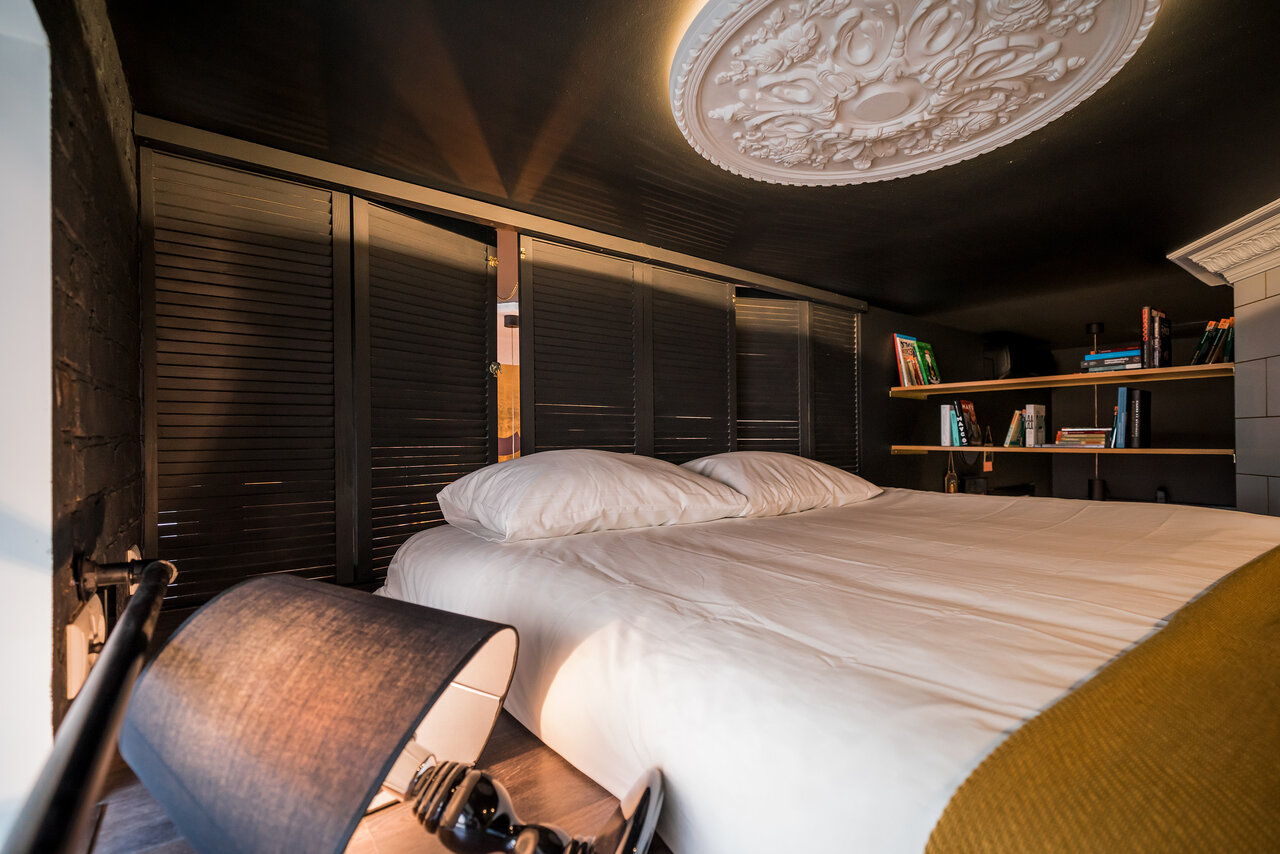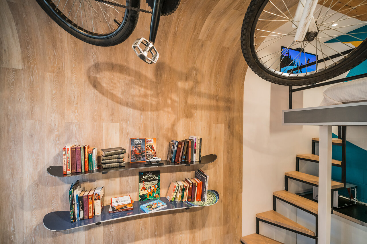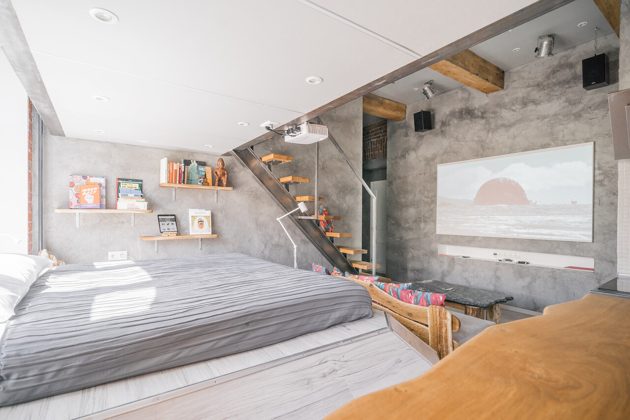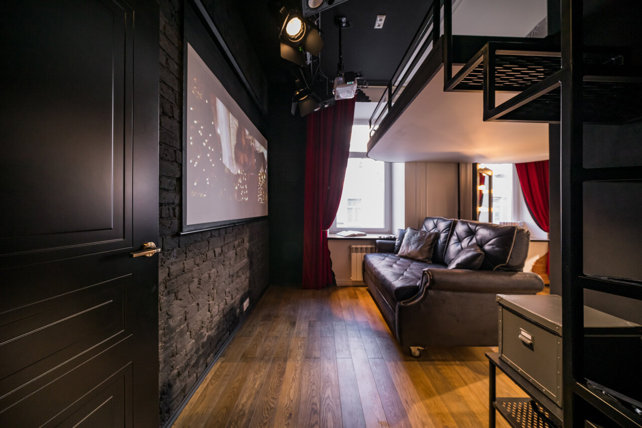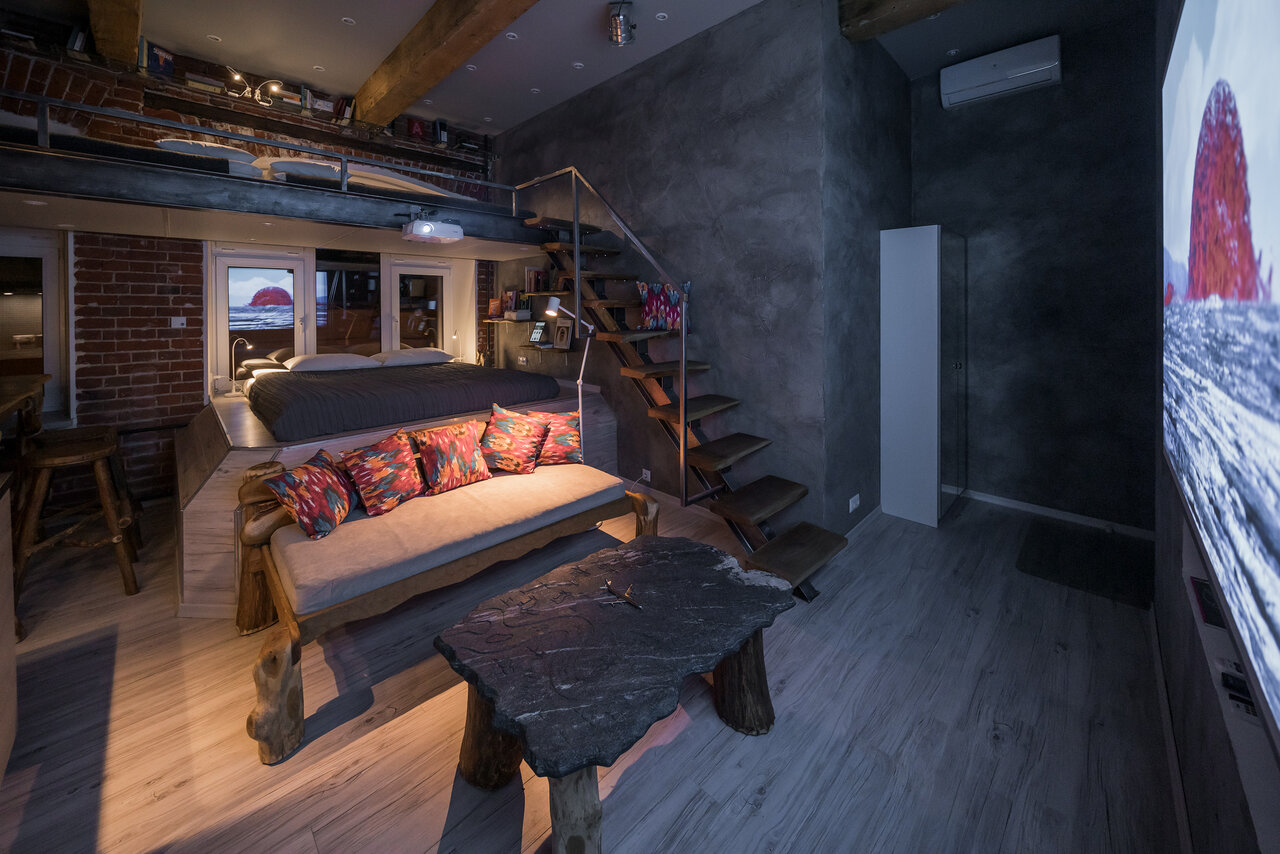 Стены студии «Магма» имитируют стены пещеры с высокими сводами. Для сохранения пространства в высоту второй ярус сделан узким и парящим — здесь вместо двуспального матраса гости найдут два односпальных места и смогут лечь каждый в своей постели. Студ
