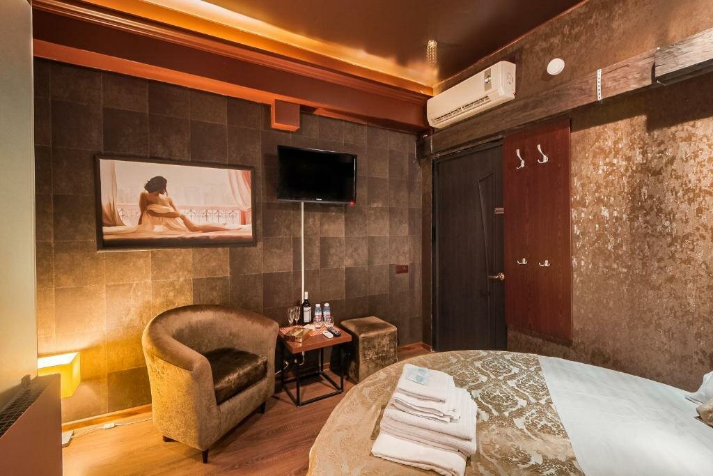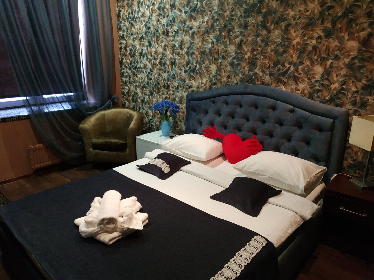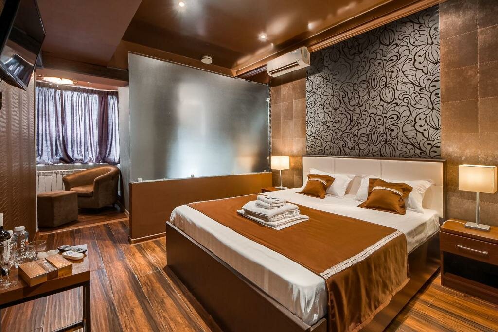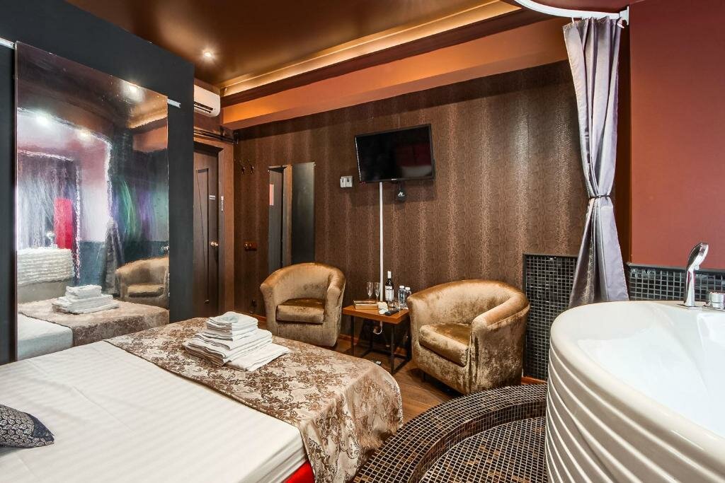 Стоимость:Час - 1200 р.Ночь (00:00 - 12:00) - 4500 р.Сутки (14:00 - 12:00) - 6500 р.Размер 22 - 28 кв. м.Большая кровать King-sizeДизайнерский стол2 стулаТелевизорСанузелХалаты, полотенца и мыльные принадлежностиКондиционе