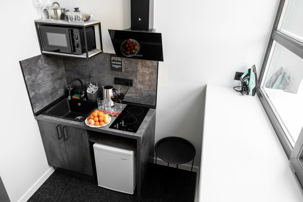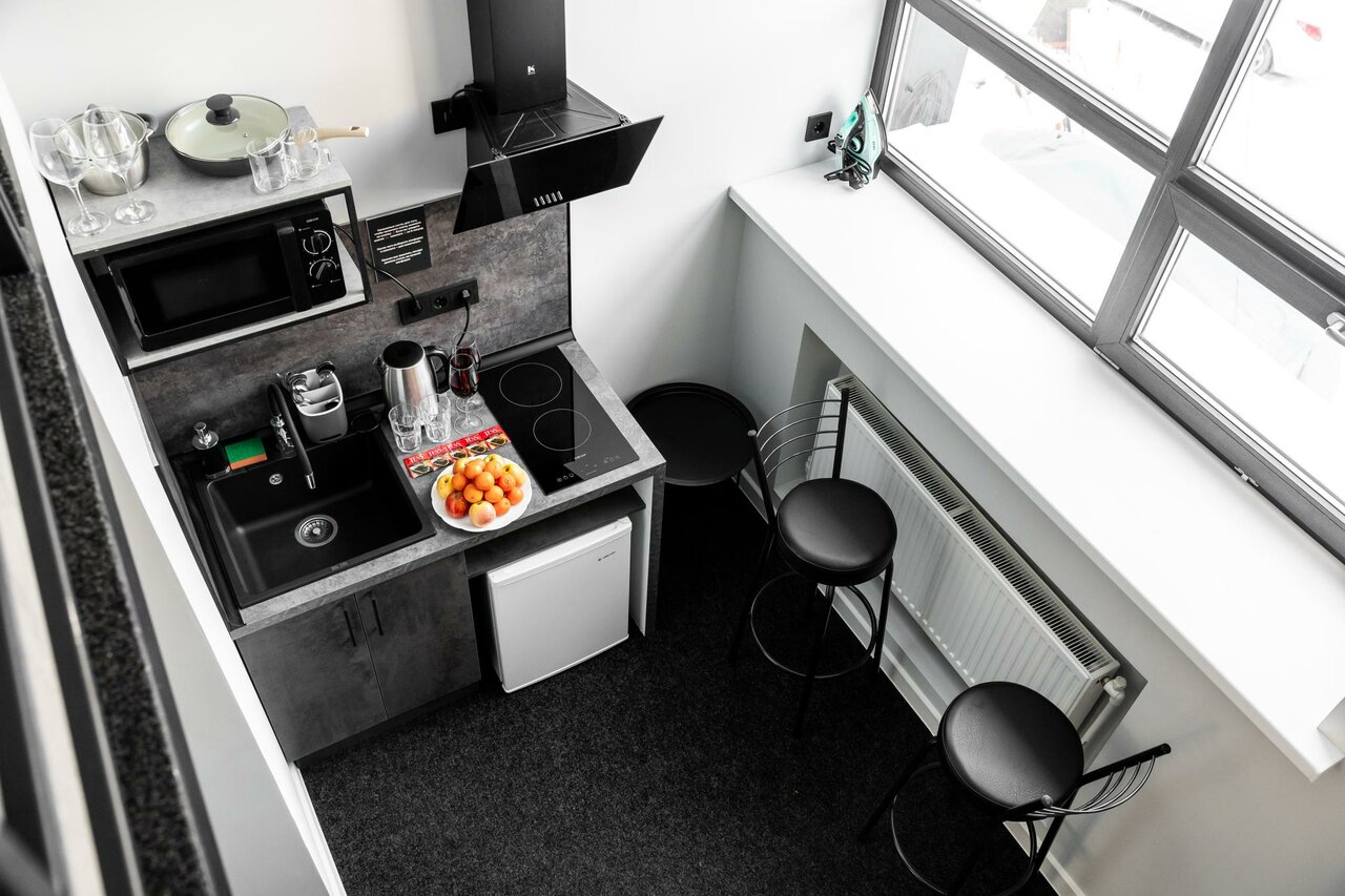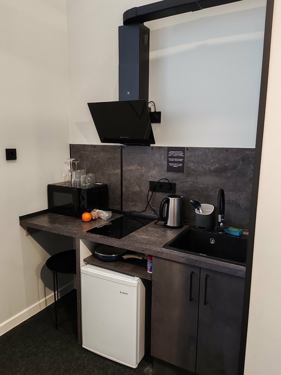 Классный отель! Очень интересное решение — двухуровневые номера! Внизу кухня- прихожая, туалет, душ, а наверху спальня. Уютно, чисто, тихо, удобно. Есть полки для вещей, плечики, гладильная доска, сушилка для вещей, микроволновка, чайник, холодильник, посуда. Нам с дочерью очень понравилось! Минимализм и комфорт!