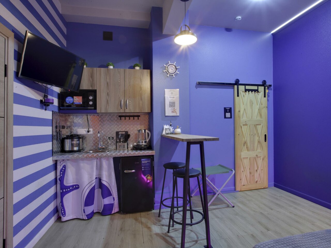 Все продумано и сделано с душой. Но шумоизоляция слабовата постоянно слышны голоса и звуки. Очень долго ждать горячей воды. Неплохо бы добавить блэкаут шторы.