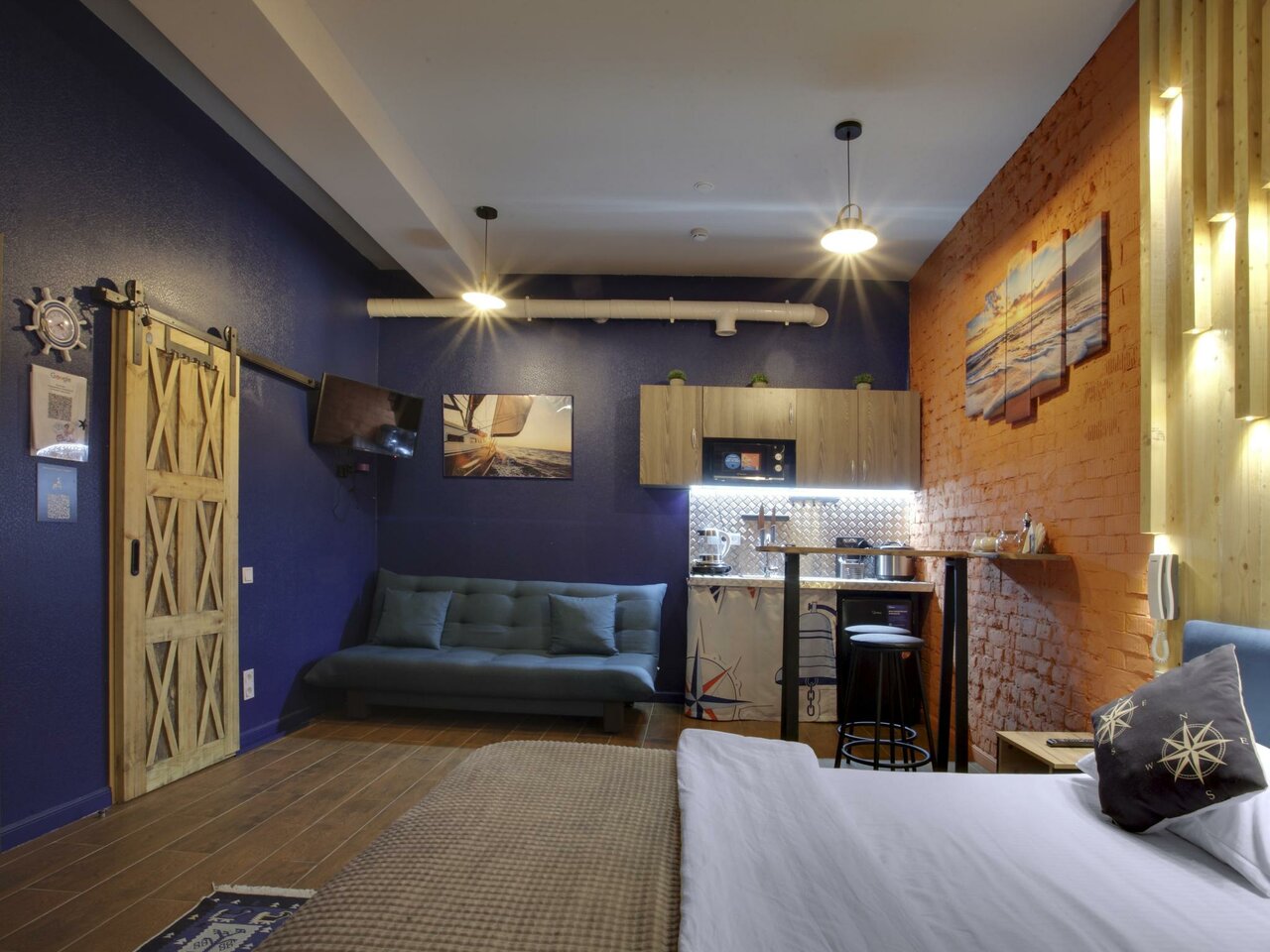 Решающим пунктом при выборе отеля стал дизайн – кирпич и дерево в интерьере делают номер стильным и современным. Есть всё необходимое для комфортного проживания. Из минусов – очень хорошая слышимость соседей, а также для меня минусом стала невозможность открыть или расшторить окно – минус жилья на первом этаже)