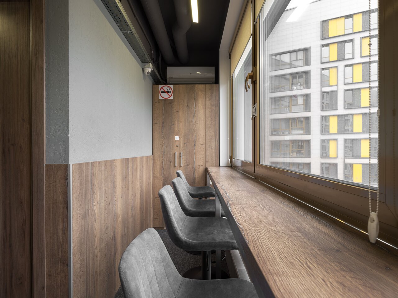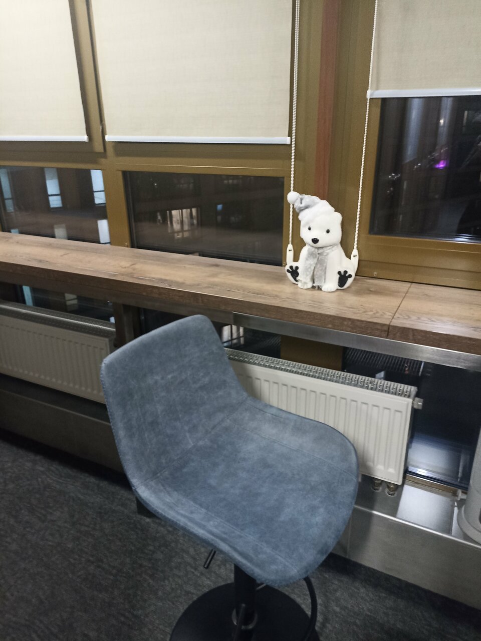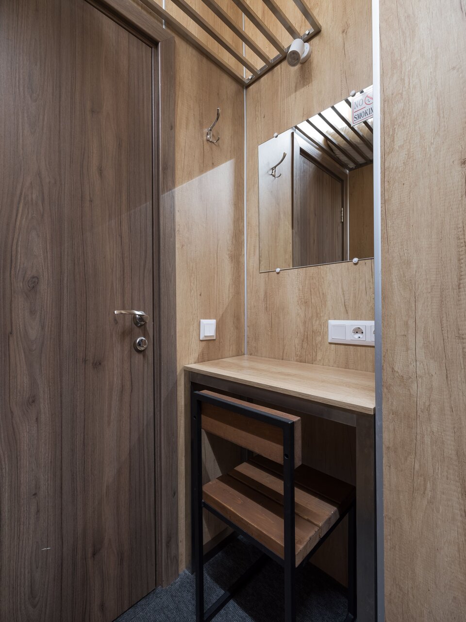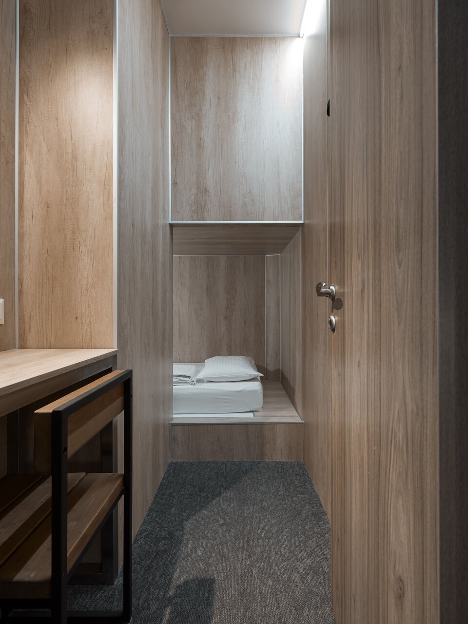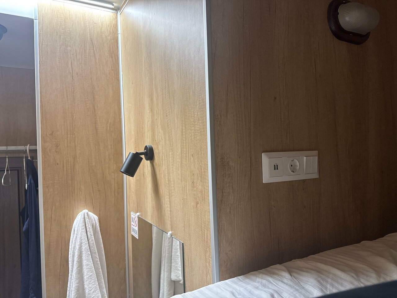 Вроде хостел, но ты спишь в отдельном хоть и половинчатом номере. Переживала, чтоб будет нечем дышать, но есть вентиляция. Свои спальное место, стул, столешница и зеркало. Дверь — закрываешься изнутри и спишь. Для 1-2 ночей прекрасно. Чистые светлые санузлы, фены думаю слабоваты для длинных волос. Есть утюг и доска, также кухня с посудой. Общая рабочая зона с панорамными окнами впечатляет. Отдельно хочу отметить заботу администратора Елены — приветливая и отзывчивая девушка, берегите ее.