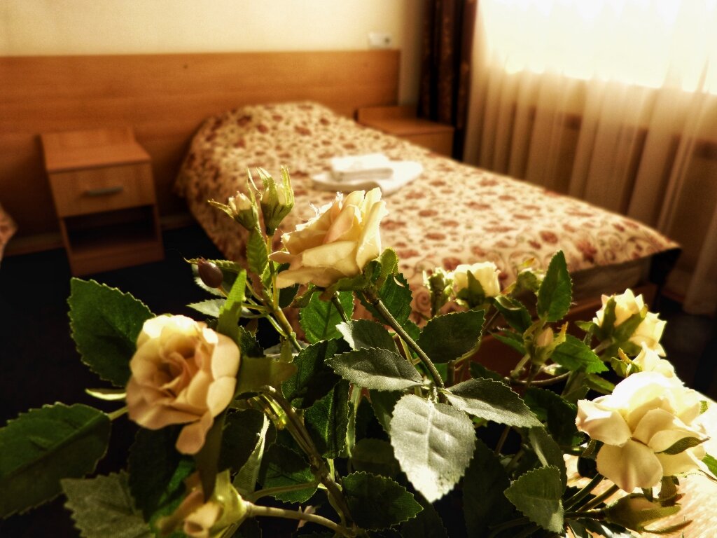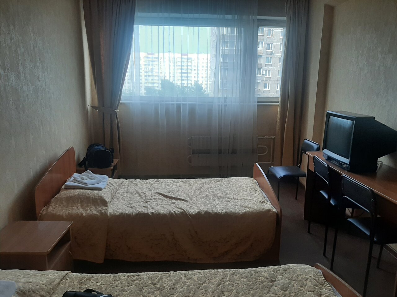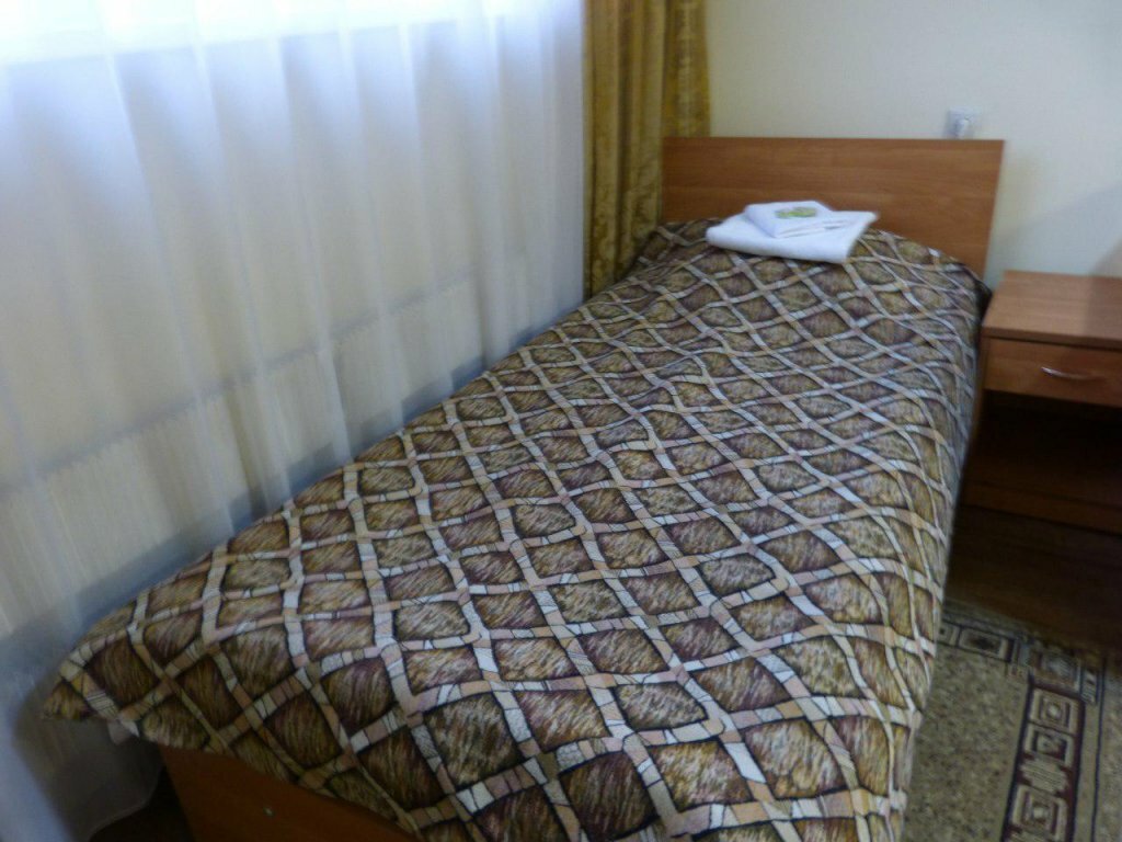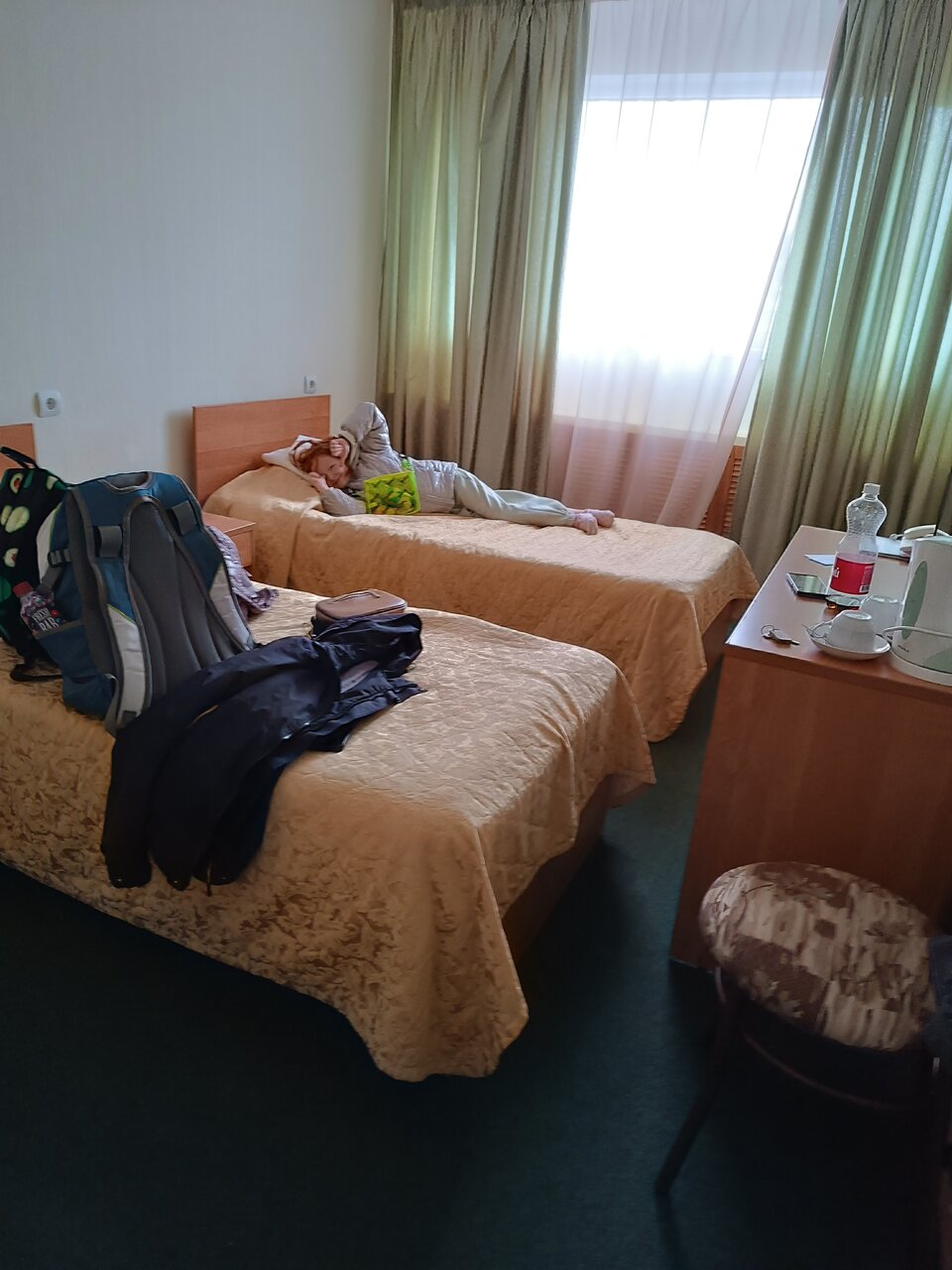 Гостиница не понравилась! В номере холодно. Холодильник вонючий Мебель и шторы старые. Телевизор нормальный. На кровати спать очень не удобно, а ещё она очень маленькая. Еле заснула. В туалет зайти нельзя, смыв непонятный. То-ли его крутить, то-ли нажимать на него надо — не разобралась. Бумаги повесили много, хотя она на столько тонкая, что когда я её разматывала, сквозь неё могла видеть свою руку. Свет тусклый как в туалете, так и в душе. Также в душе зеркало грязное. Над ним лампочка светит тускло-зелёным светом. Вода в кране рыжая. На завтрак у нас был шведский стол. Скажу так — я ожидала большего. Лежали в ряд оладьи, омлет, запеканка, нарезка сыра и ветчины, сметана, яблочный джем и два вида каши. Также чай и кофе. Кипяток у них не вкусный. Омлет и оладьи, которые я пробовала были холодными, хотя пришли мы рано. Оладьи и батон были не свежими.
