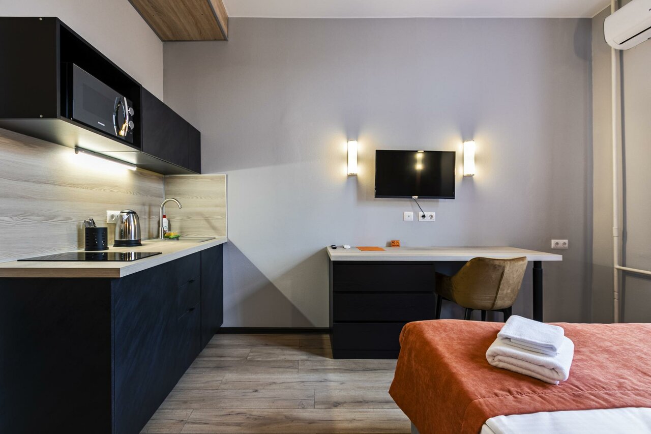 Уютные, современные апартаменты с собственной кухней и ванной комнатой с душем. Уменьшенная версия апартаментов 'Комфорт Плюс' площадью 14 кв.м. Подход к кровати только с одной стороны.