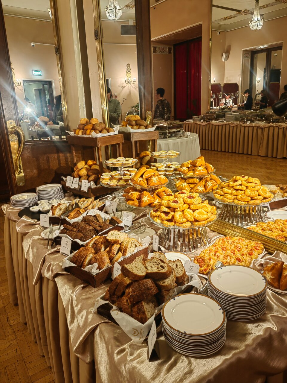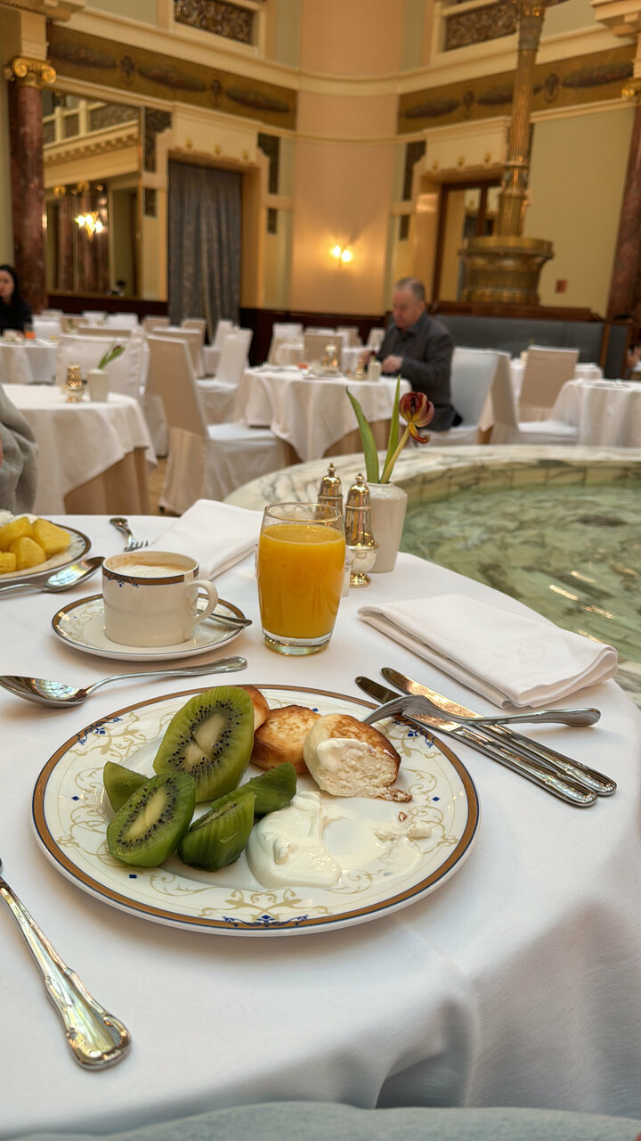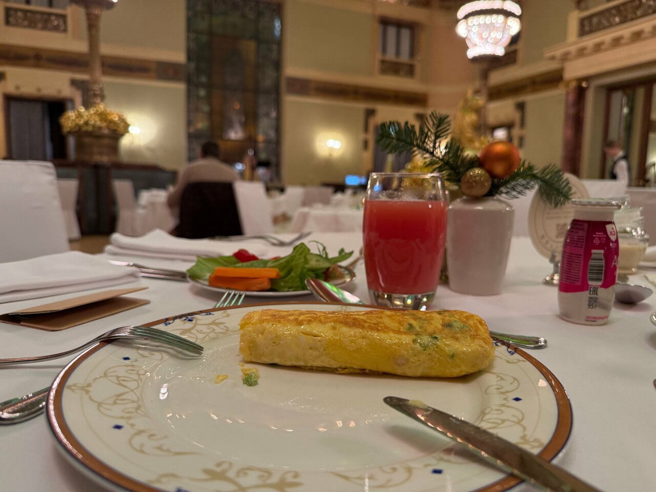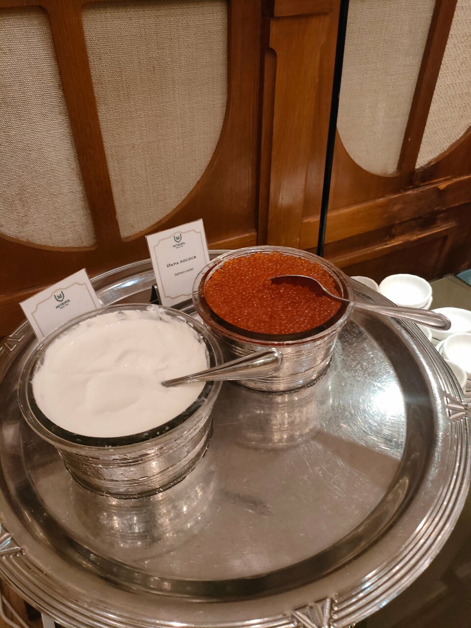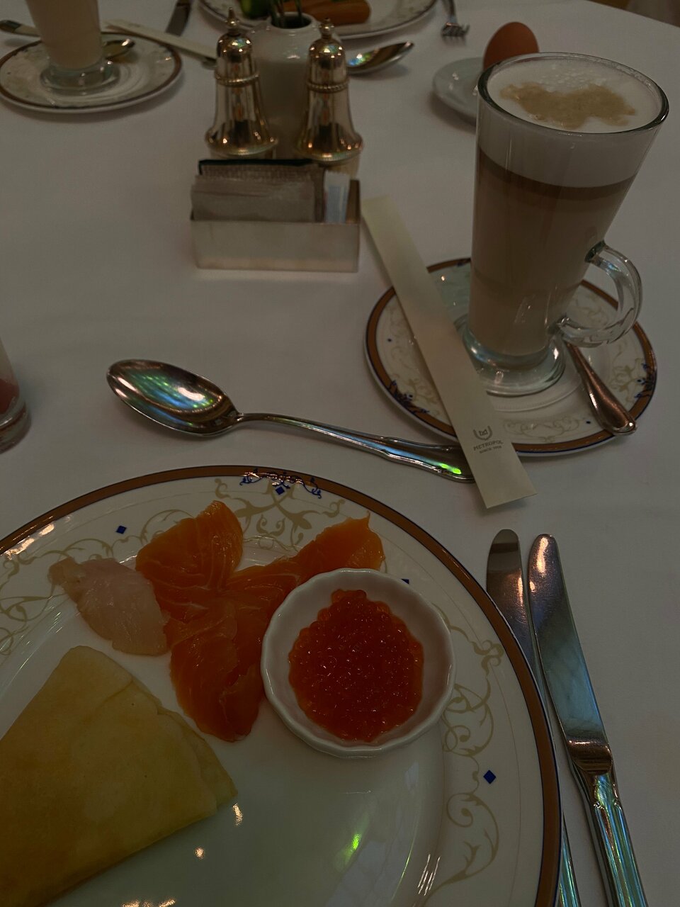 Были на завтраке в отеле. Потрясающий сервис, изысканный интерьер, играет арфа. Достаточный выбор еды. Есть и икра, и красная рыба и небольшая азиатскаястанция. Отдельное спасибо официанту Степану за первоклассный сервис