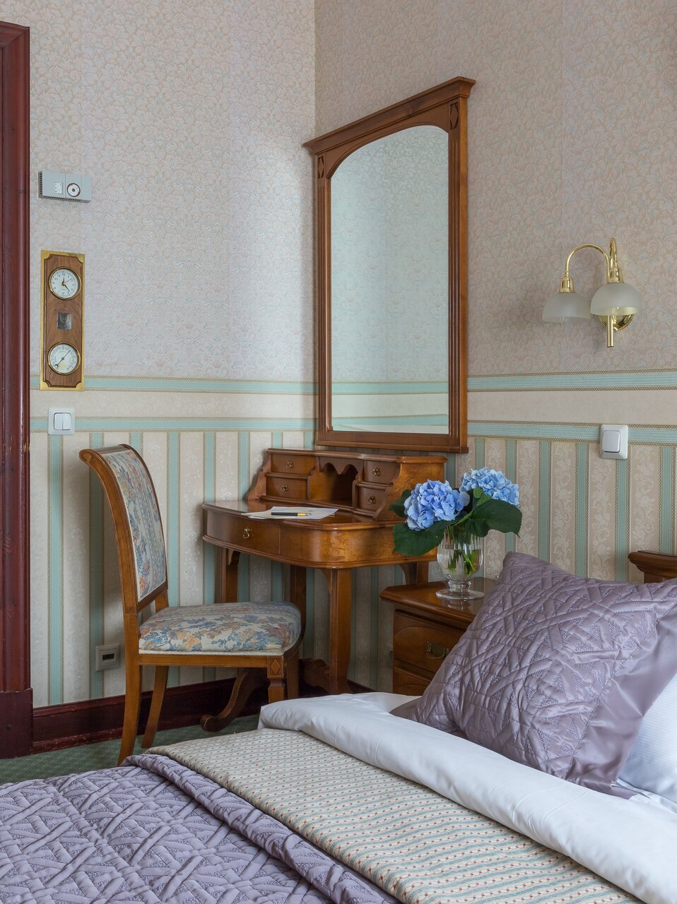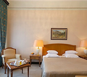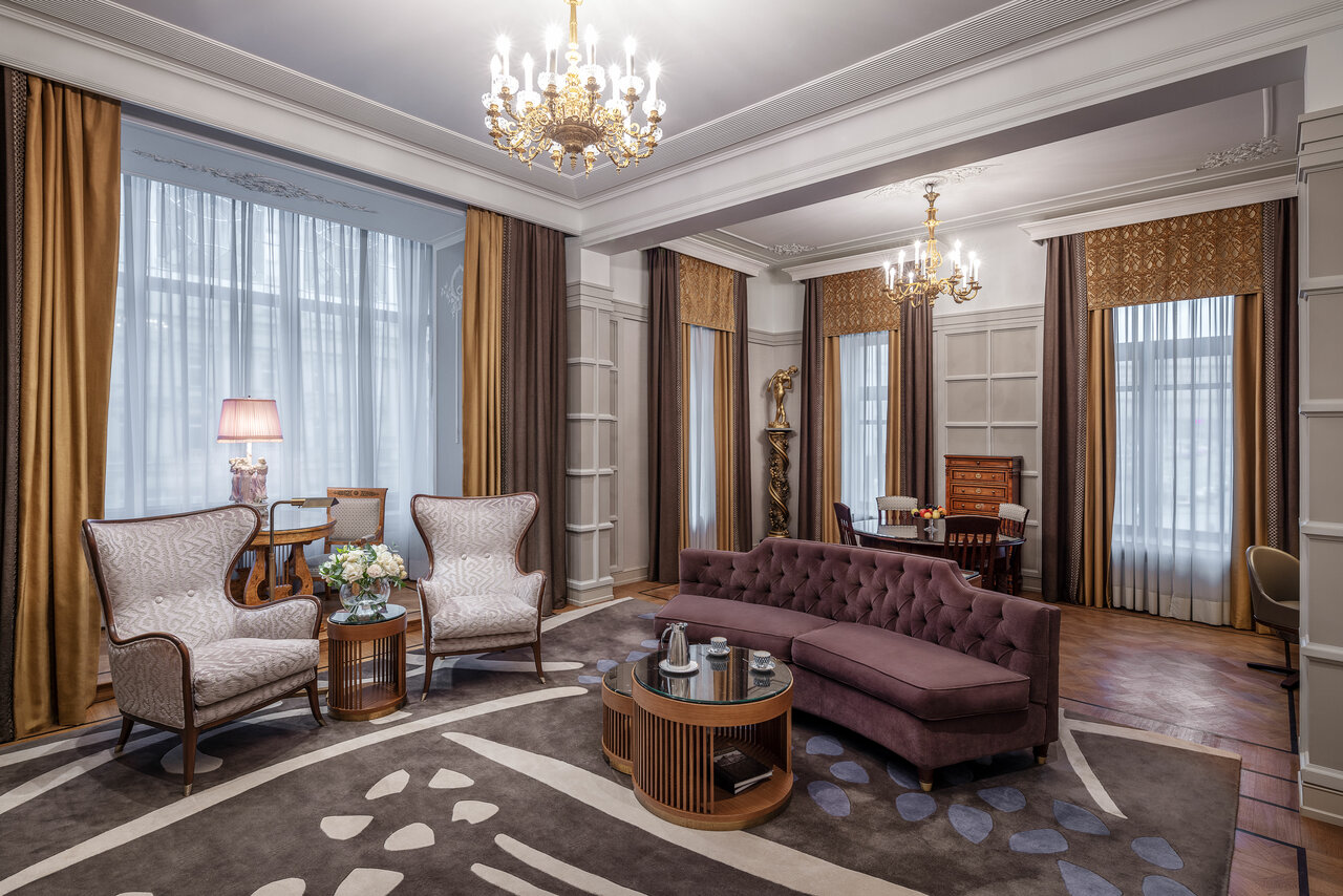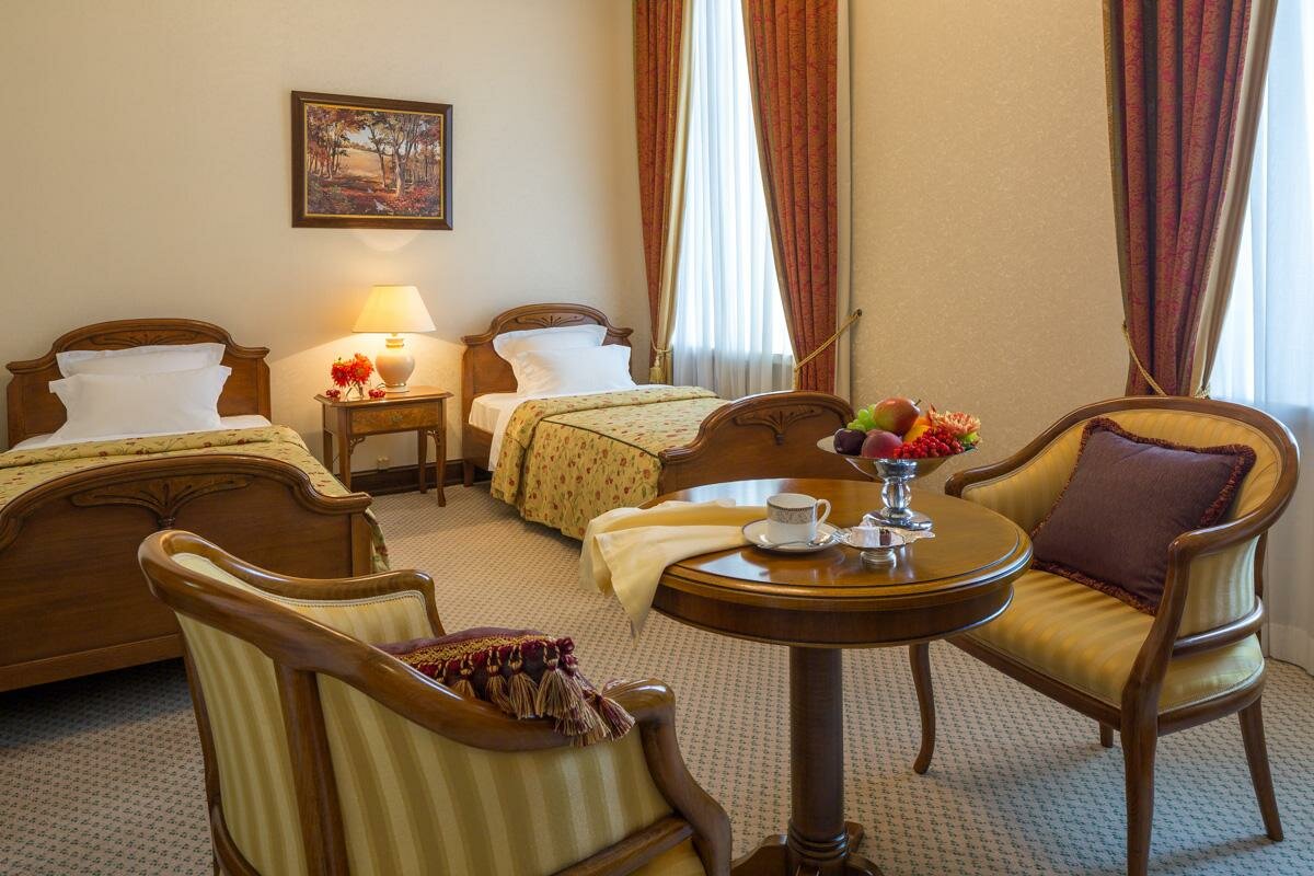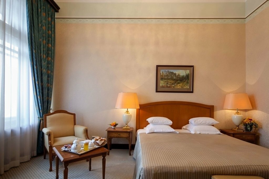 Расположение шикарное. Вид из окна волшебный. В номерах есть балконы на которых находиться летним вечером одно удовольствие. Само здание очень красивое и внутри — как в музее. Понравилась зона приема пищи на завтрак и стеклянным куполом и фонтаном. Номера в удовлетворительном состоянии: паркет потертый, интерьер в Советском стиле, номера огромные и стоящая мебель смотрится несимметрично и пусто. Но сейчас начали ремонтировать номера и возможно уже есть номера с новым интерьером. Цены — космос.