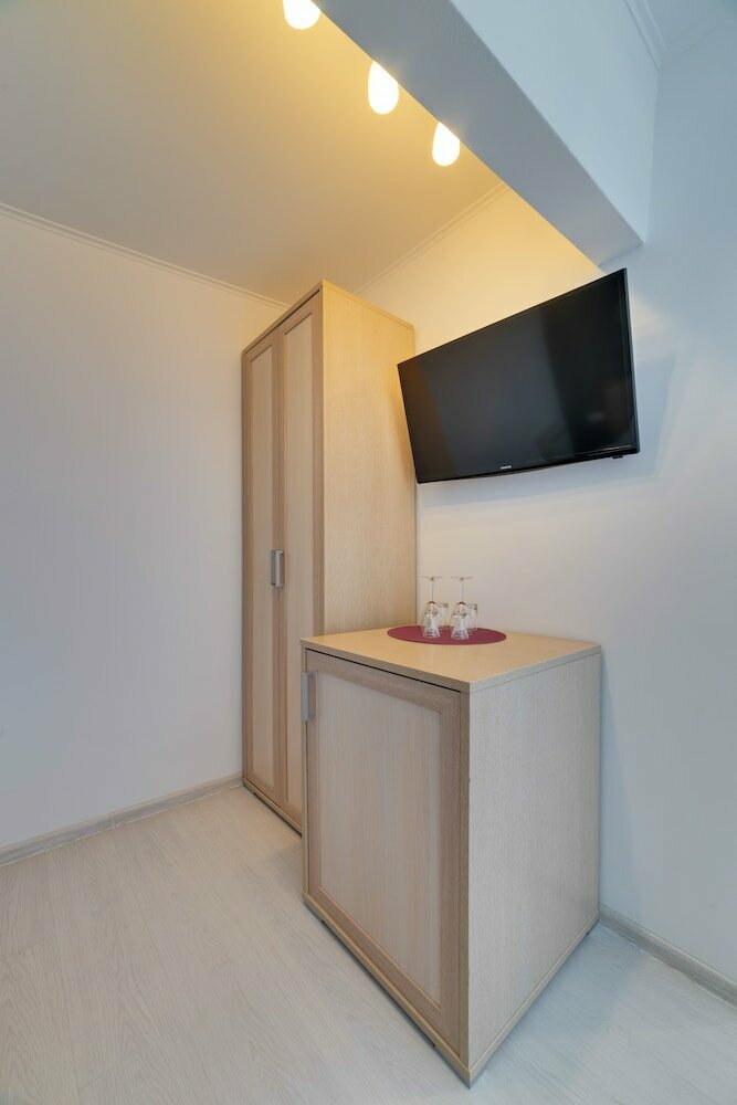Двуспальная кровать с полноценным матрасом, две прикроватные тумбочки с розетками, шкаф с небольшим сейфом, письменный стол, яндекс-ТВ с подключенным Кинопоиском. В номере мини-холодильник, рядом кулер, микроволновая печь, посуда и бокалы для вина.