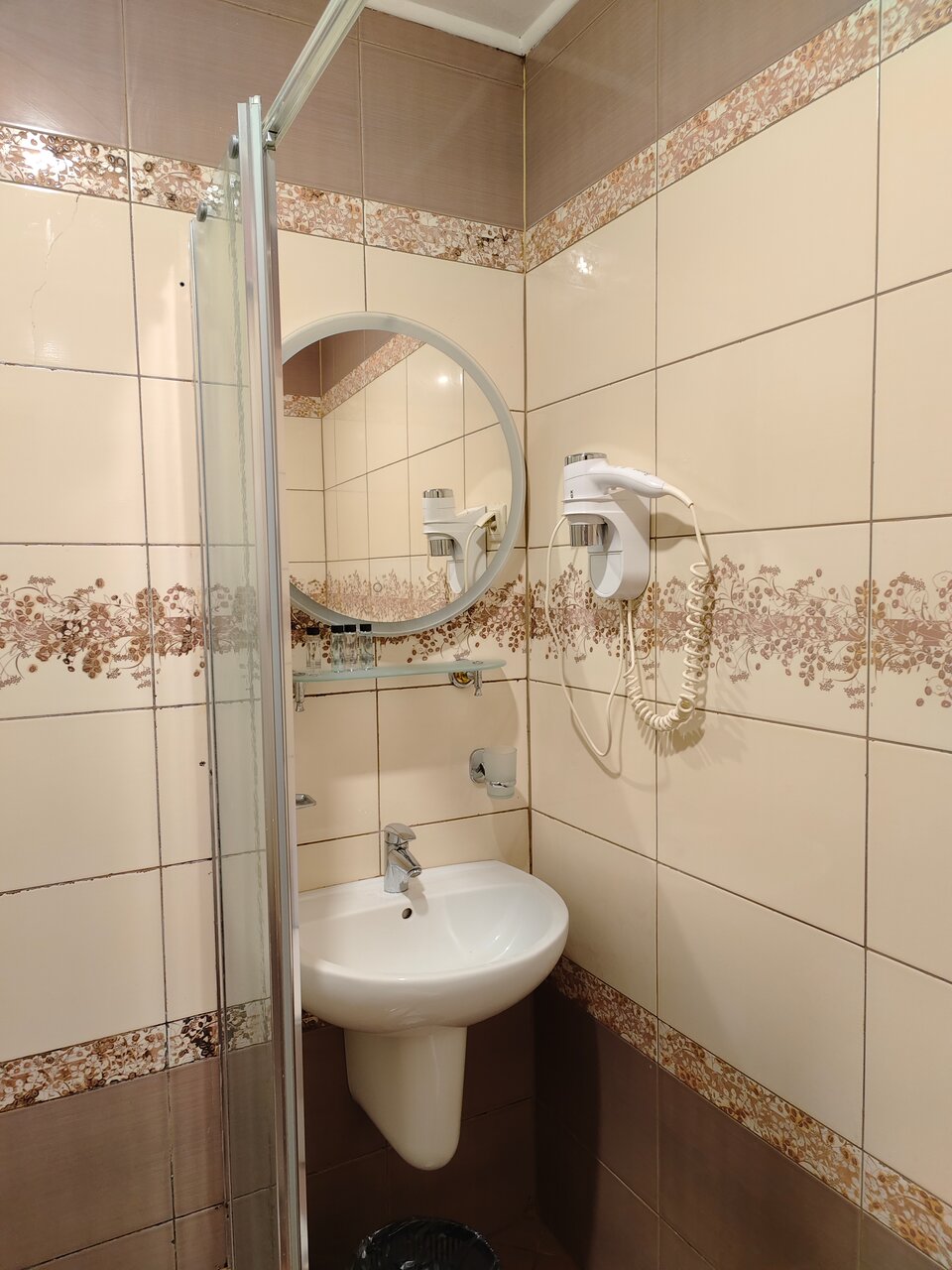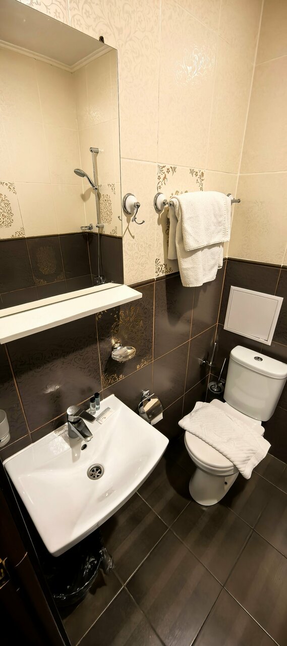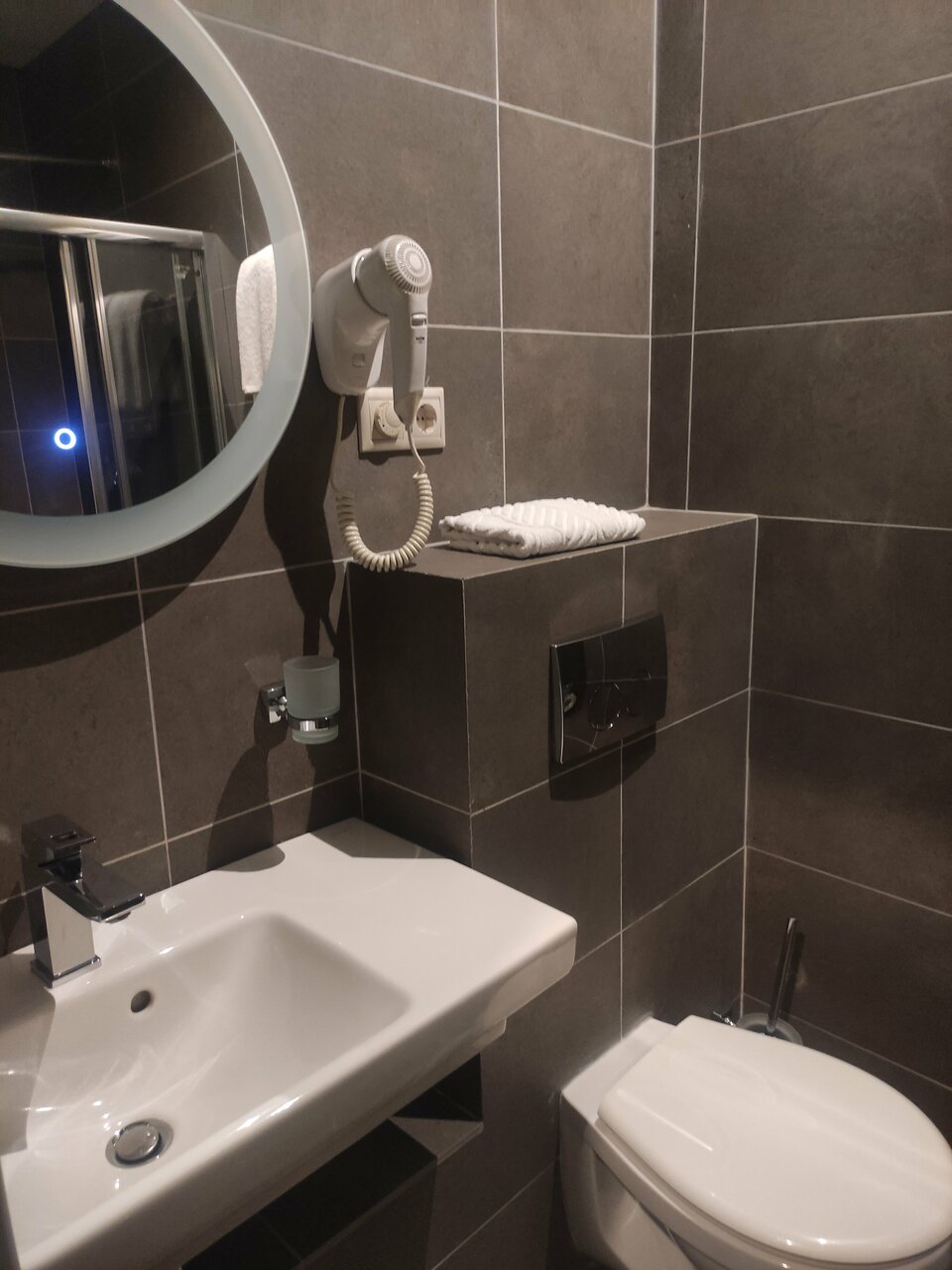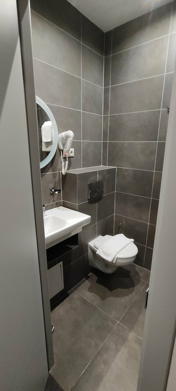 Микроскопический номер. Крохотный санузел, душ, раковина и унитаз, прям в одном флаконе, можно сказать)) После приема душа всё мокрое. Чисто, персонал нормальный.
