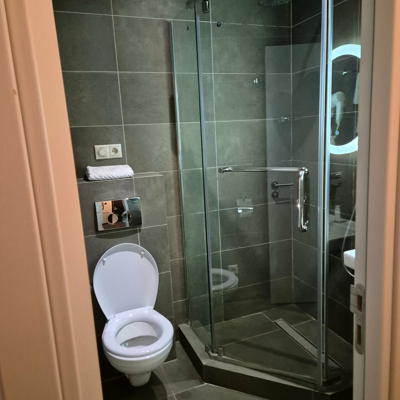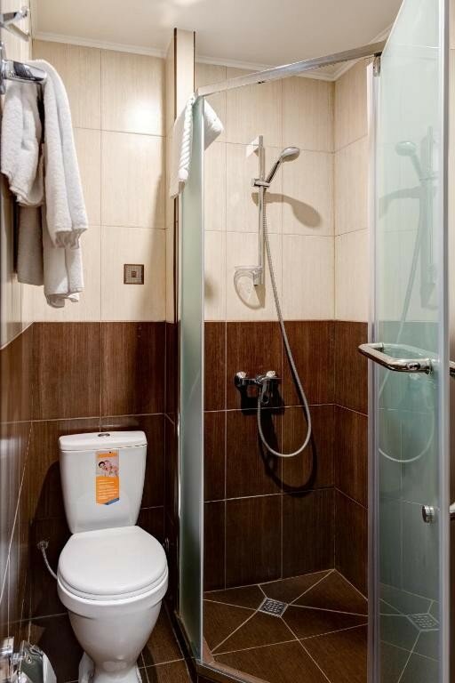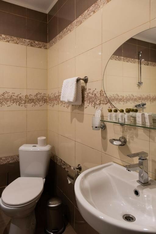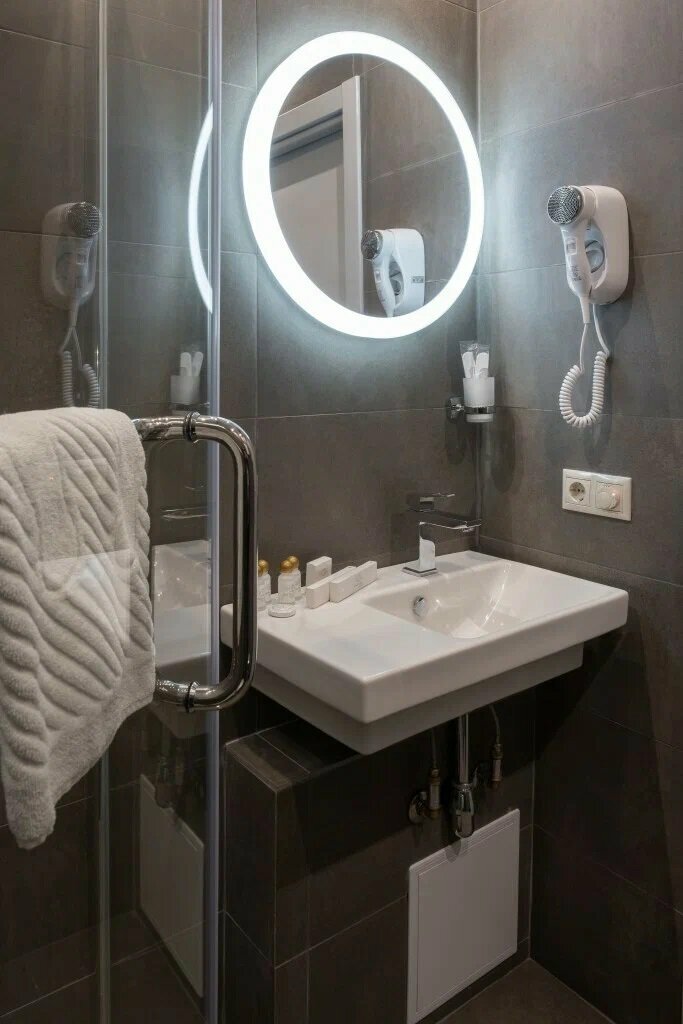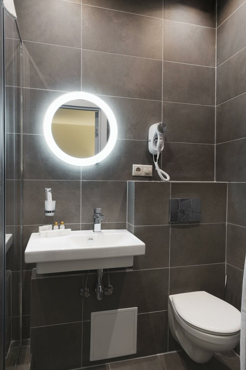 Микроскопический номер. Крохотный санузел, душ, раковина и унитаз, прям в одном флаконе, можно сказать)) После приема душа всё мокрое. Чисто, персонал нормальный.