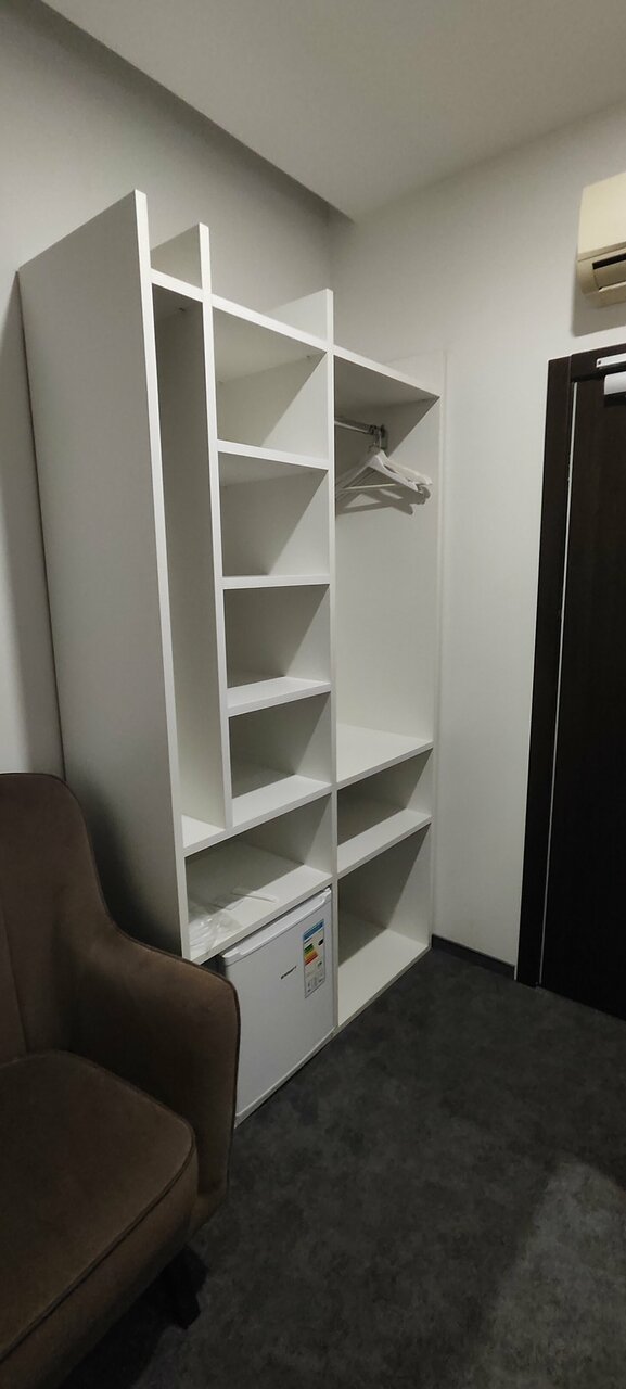 - Отсутствие полок и шкафов для вещей