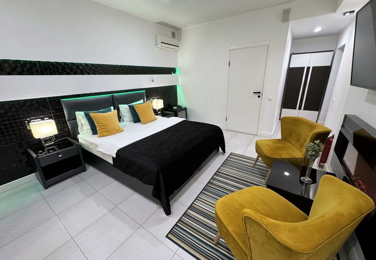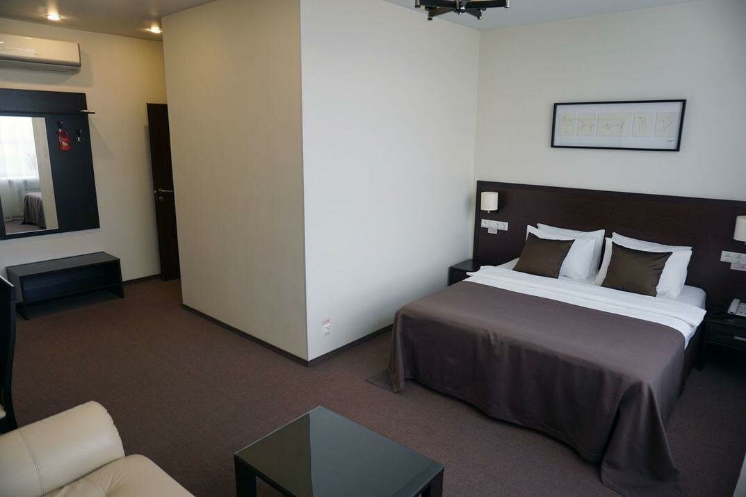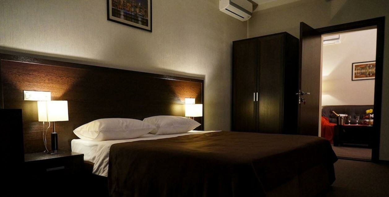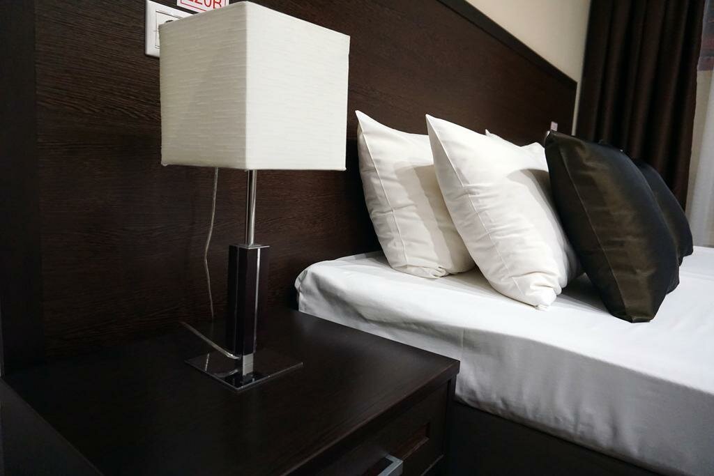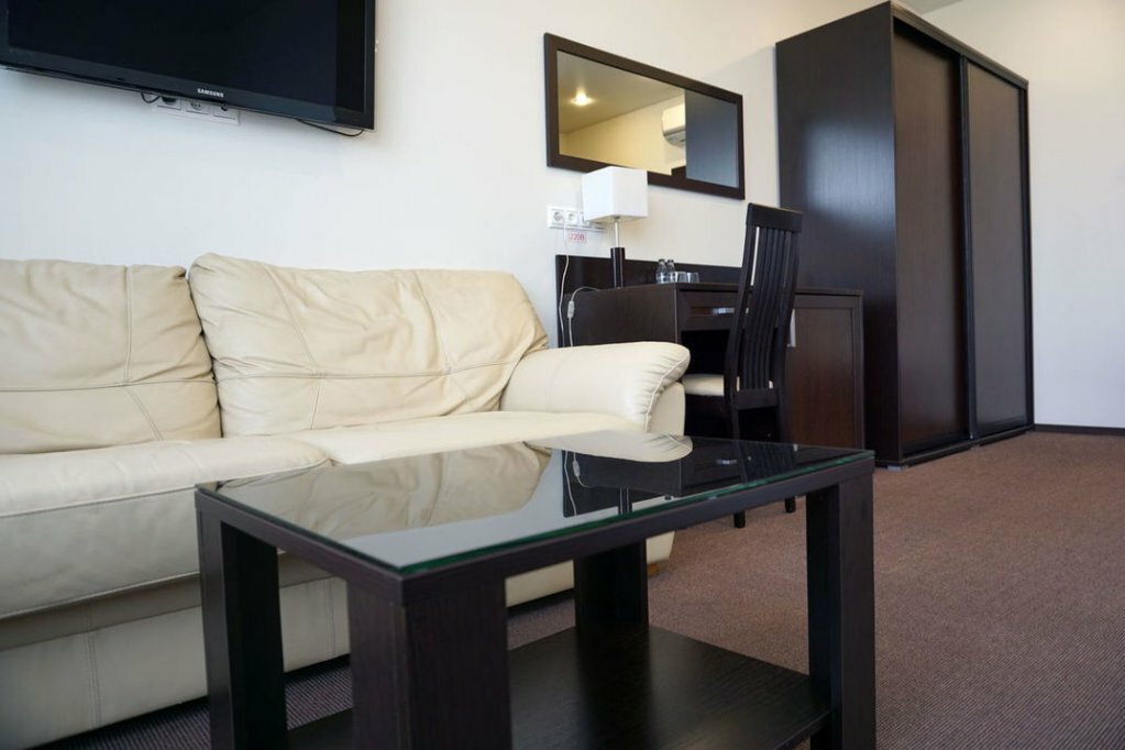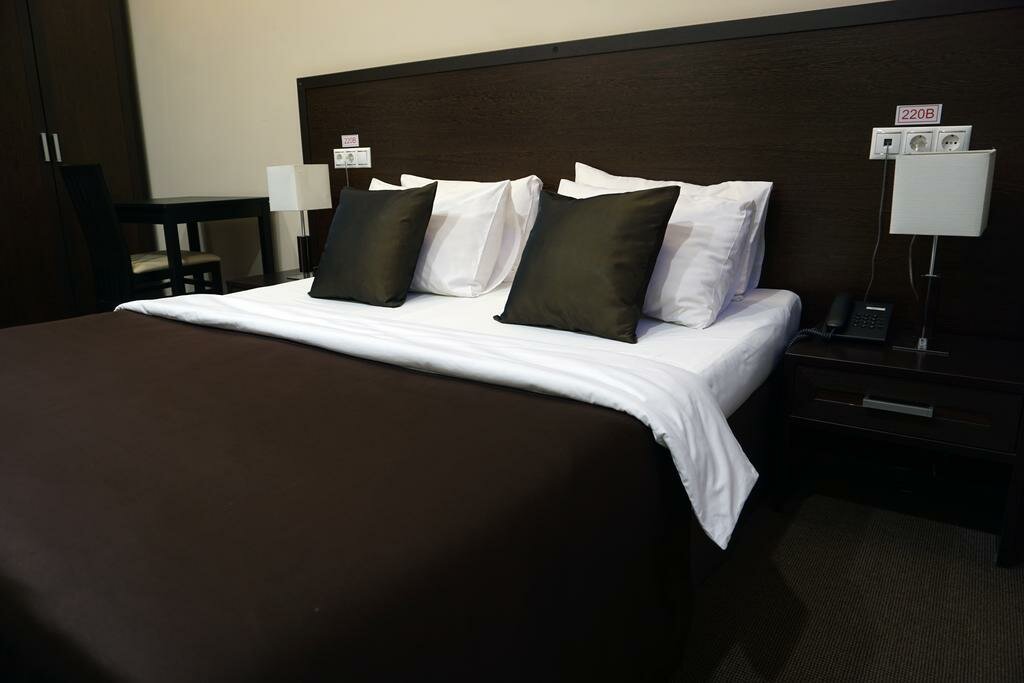 В номере собственная ванная комната, спутниковое TV, сейф, кондиционер, холодильник, широкая кровать, ортопедический матрас, белоснежное сатиновое белье, тапочки, гладильная доска, принадлежности для чаепития, Wi-Fi, просторное рабочее место.