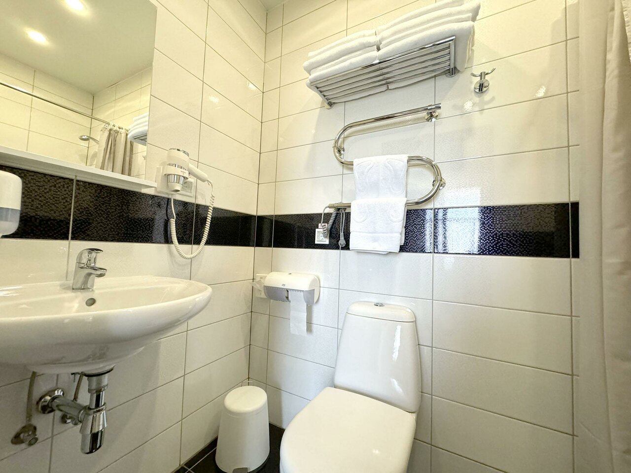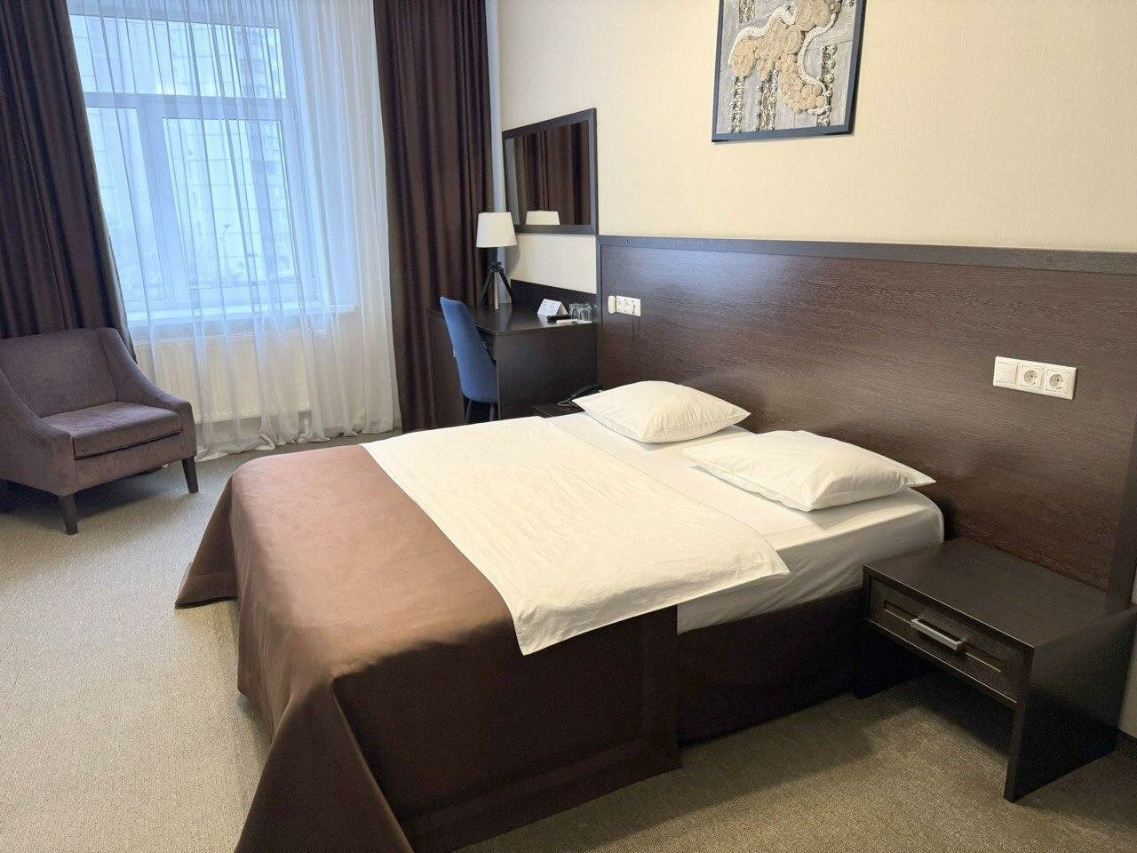 Современная удобная кровать с ортопедическим матрасом, рабочее место, кондиционер, светонепроницаемые шторы, сейф, холодильник, спутниковое TV, душевая кабина, фен, гигиенический набор, халат, тапочки, чайник, кофемашина и все для чаепития, Wi-Fi