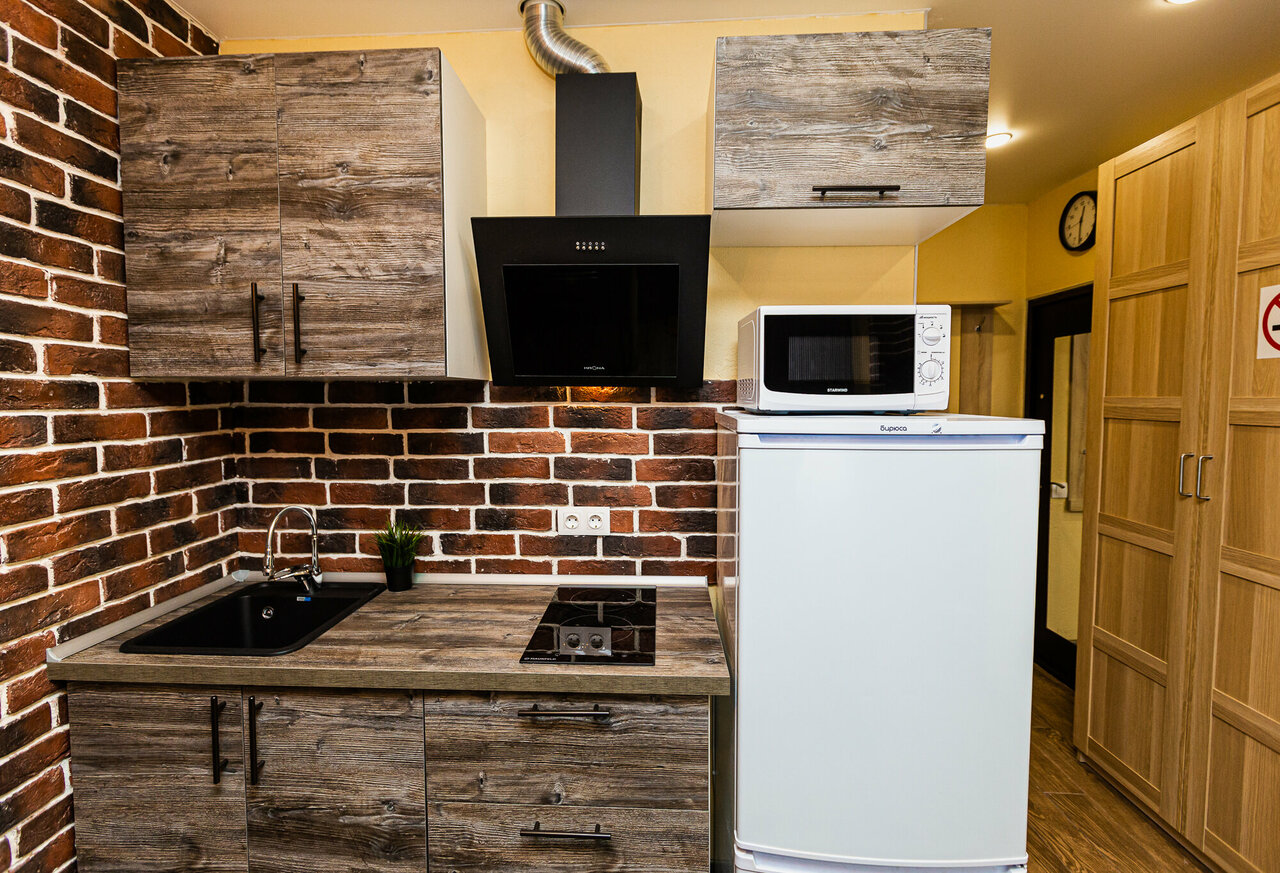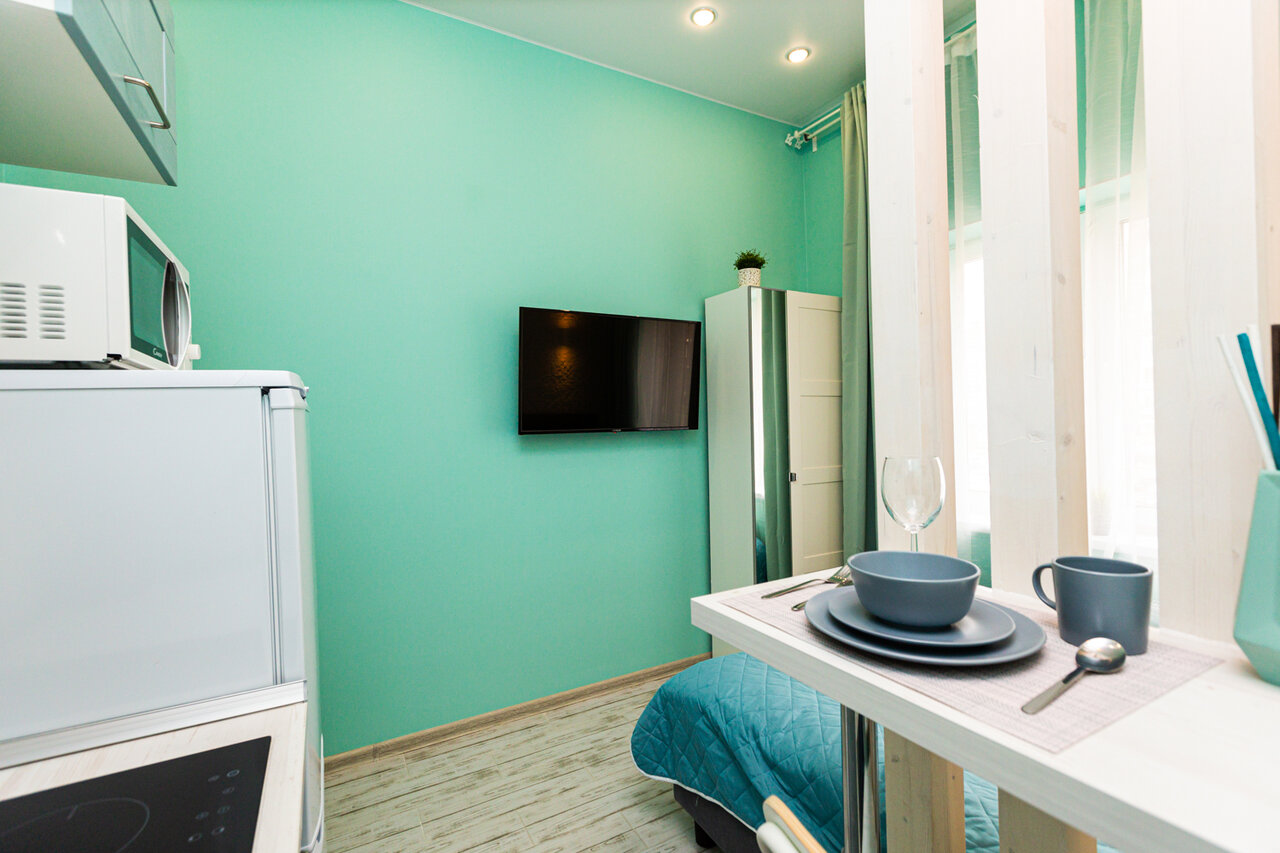- Хорошая оснащенность (фен, утюг, посуда, микроволновка).