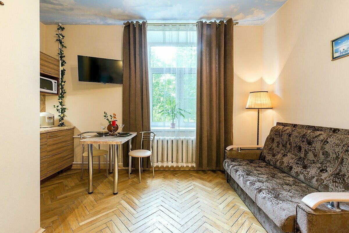 Размещает до 4х гостей. 2 спальных места: 2х-спальный диван и большая 2х спальная кровать на втором уровне. Открвается чудесный вид на Казанский собор. Кухня полностью оборудована. Есть белье и полотенца.