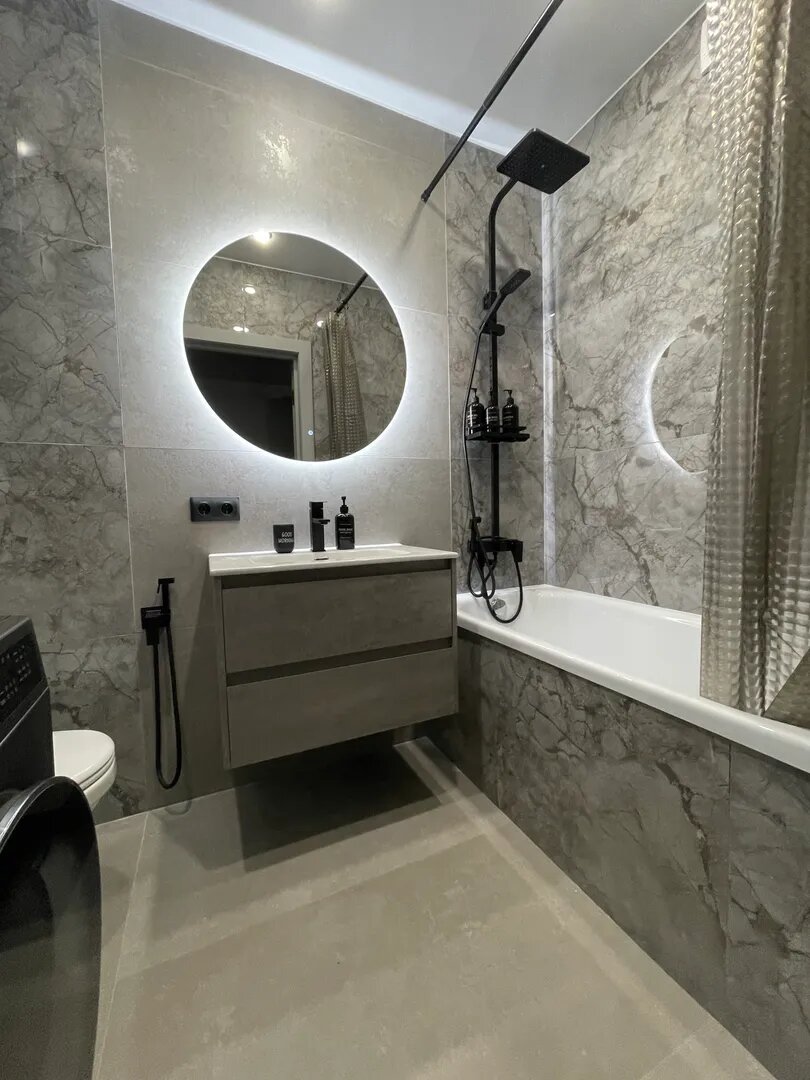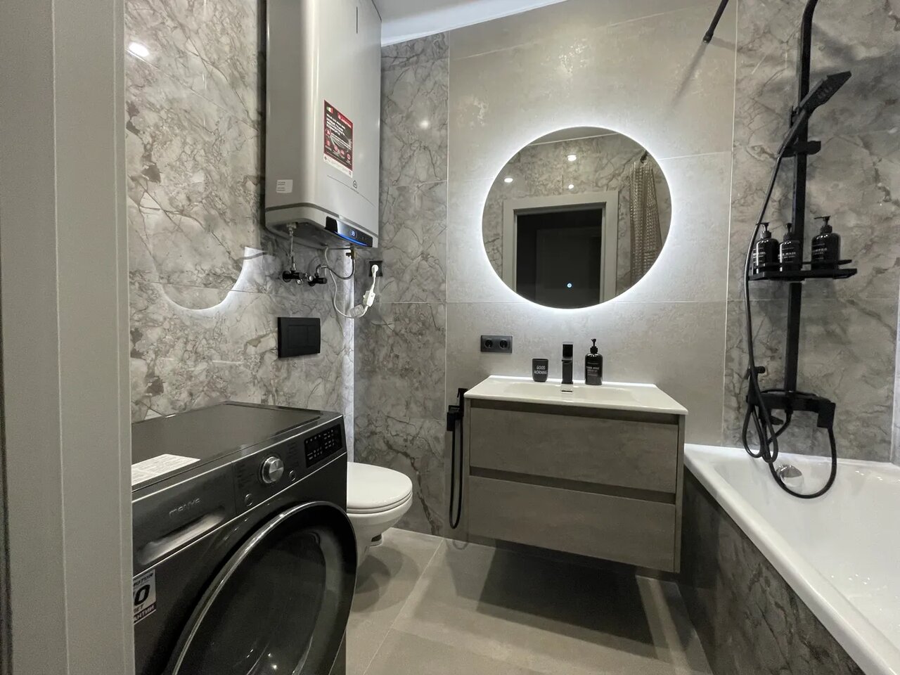 Двухкомнатный номер с двуспальной кроватью и дополнительной односпальной кроватью. Ванная комната в номере.