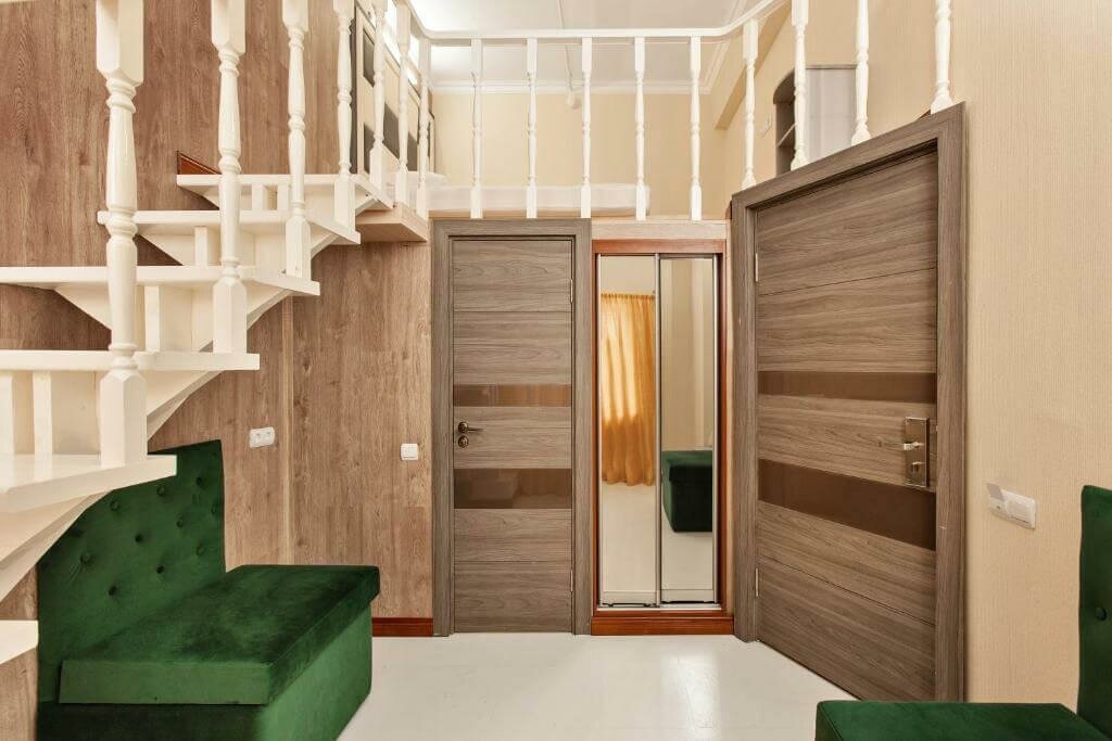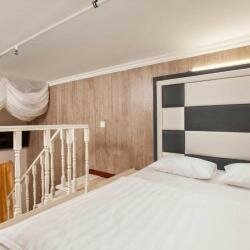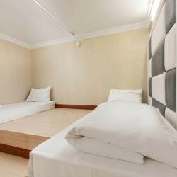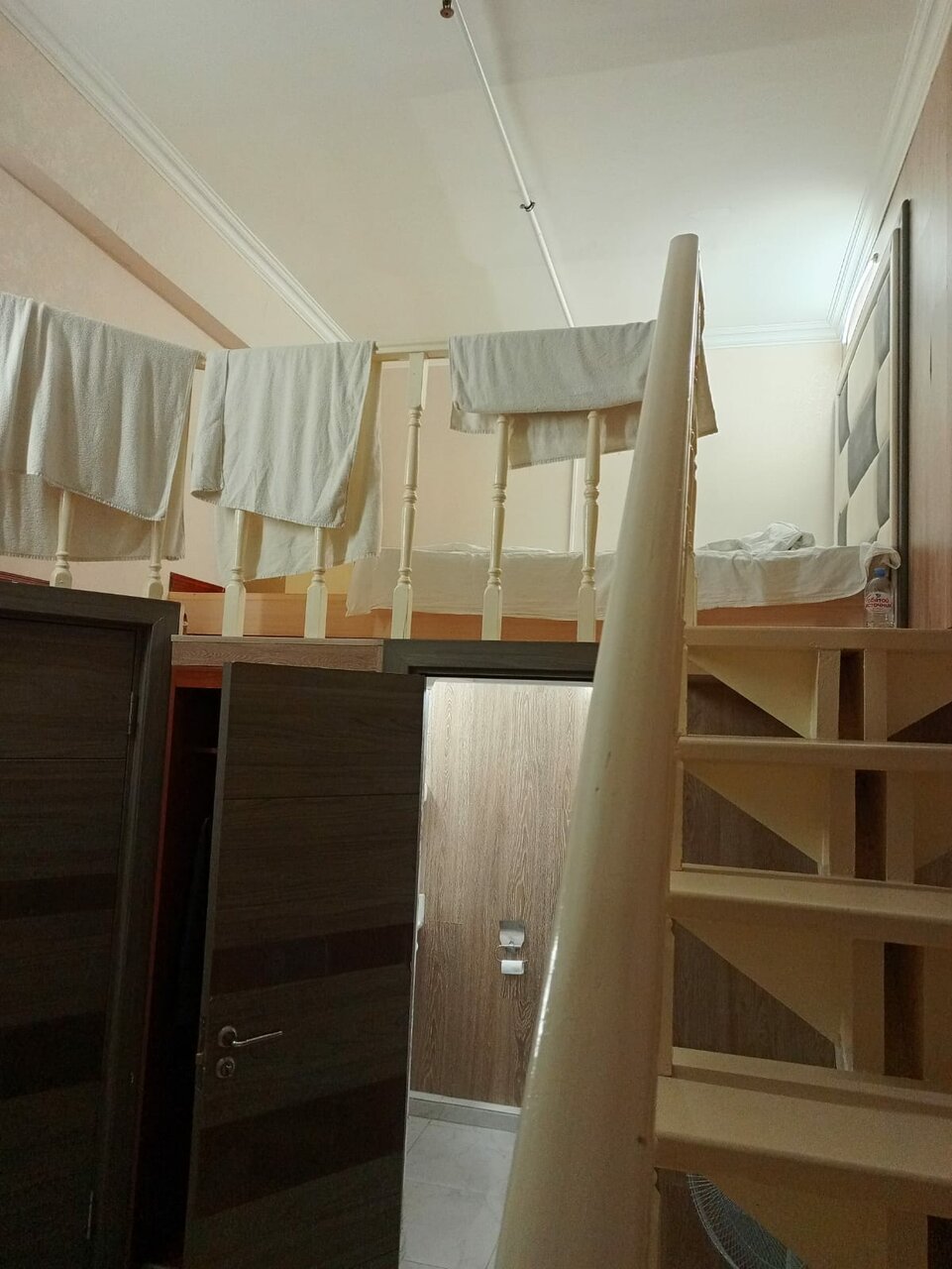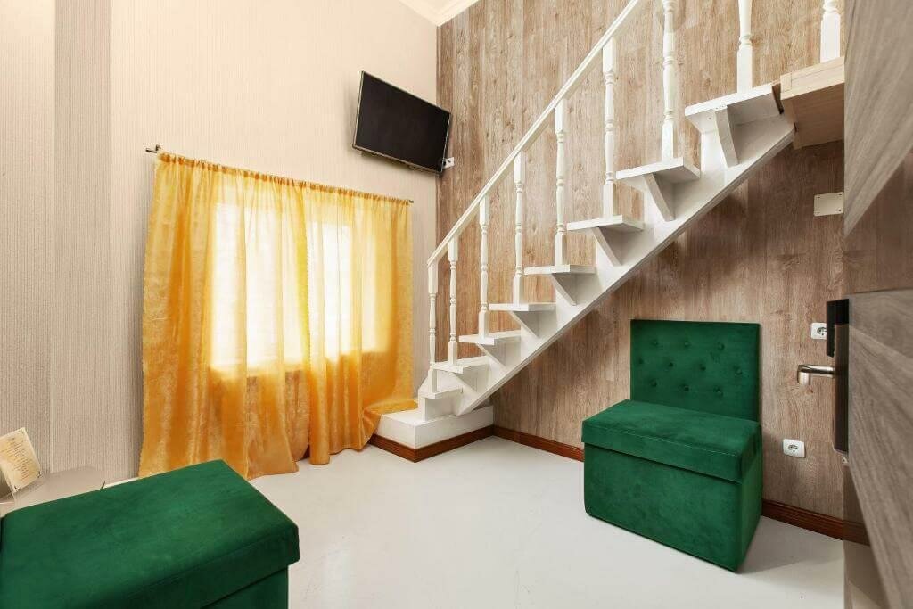 Худший номер в мире. Забронировали через озон, в итоге вышло 7500 за 4 ночи, на ресепшене сказали, что номера стоят дороже, но доплачивать не попросили, у нас уже было оплачено. После того как нас проводили в номер — сразу же сказали, что окно бутафорское, за ним находится спортзал, кондиционера нет, хотя везде указано, что есть. Как итог ужасная духота, после душа влажность + духота — адская смесь. Кровать, извините, матрас на втором этаже на полу — просто пружины обтянутые тканью, спать нереально. С утра из-за этого набора ужасно болит голова и ломит все тело. Номера в целом собранны из того, что найдено на мусорке, по середине потолка труба, обтянутая пленкой, когда поднимаешься на второй этаж дребезжат все стены и внизу из этой конструкции торчат шурупы. Персонал: приятная женщина и ребенок, который по ночам спит в общей зоне, что не дает возможности прийти и попить чаю или поесть. Помимо всего нет горячей воды и водонагревателя тоже нет, чайника нет. Ничего нет.