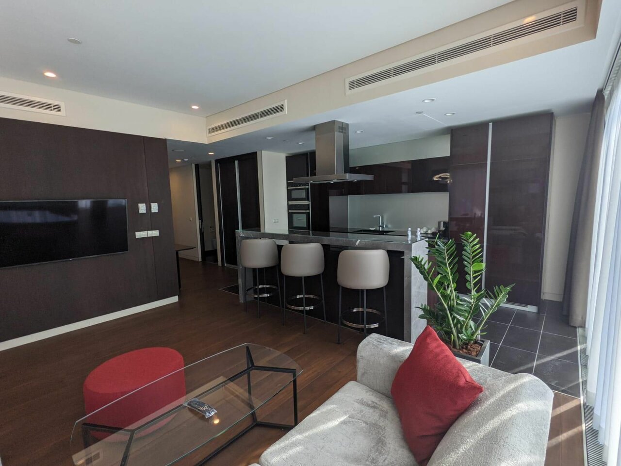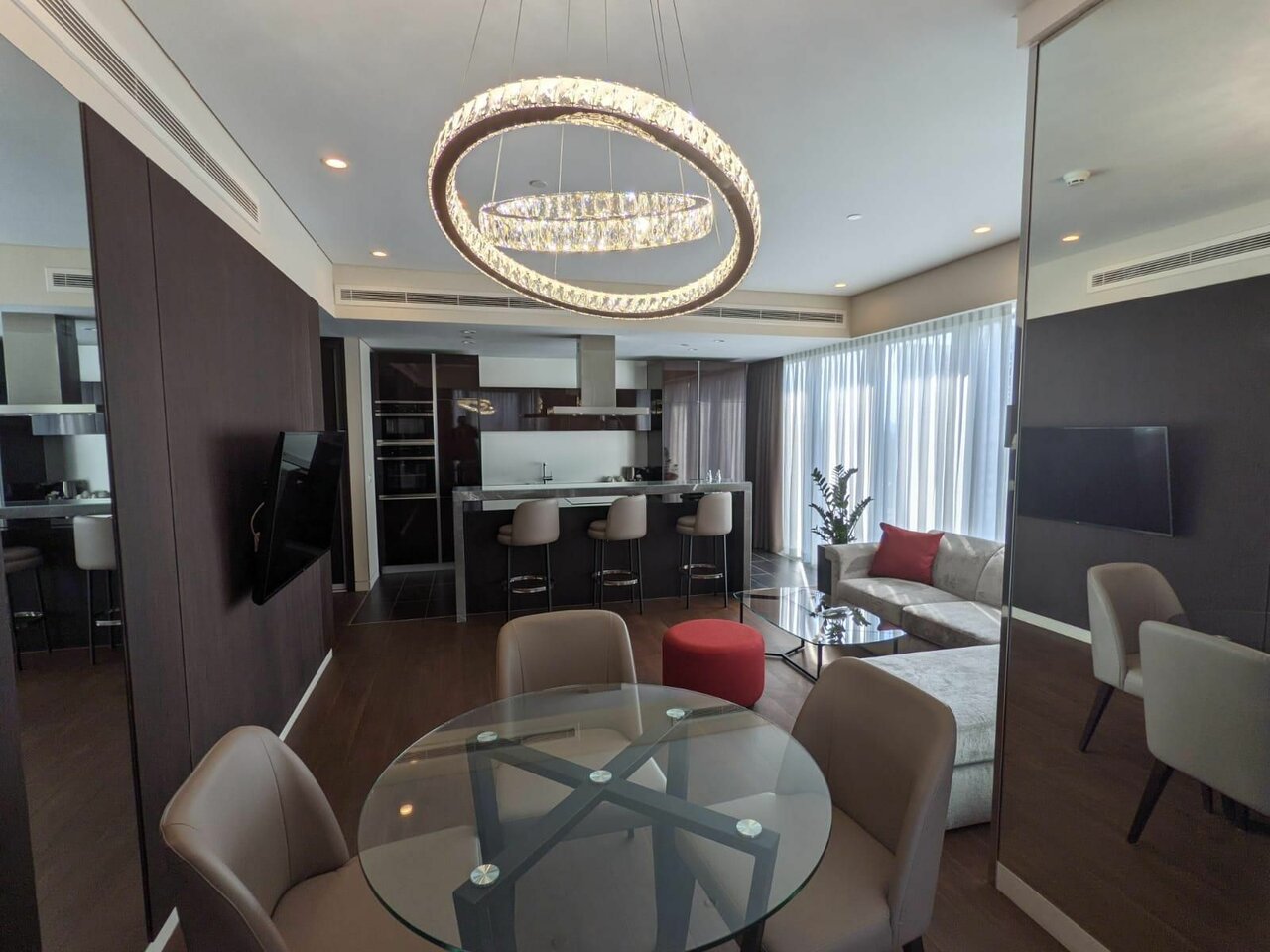 Превосходные апартаменты , есть все не обходимое для проживания , шикарные виды на город и на башни! Лучше остановиться в апартаментах где есть кухня и большая площадь , окна в пол , чем в крошечных номерах за аналогичные деньги и не высоких этажах без видов …!) рекомендую 5+!