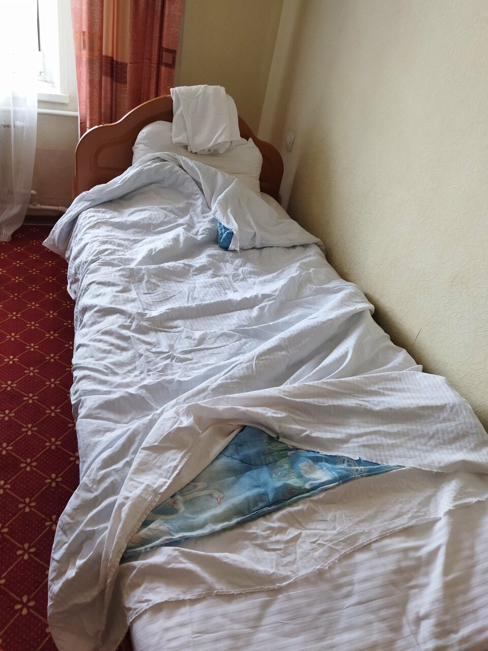 Самая отвратительная гостиница. Не дотягивает даже до двух звёзд. Банное полотенце было застиранное с дырой. Створка окна закрывалась, но наверху, при закрыто створке, оставалась щель, шириной 4…5 мм. Из этажного щита торчали провода. По всему остальному: ремонт делали в 90-х, все очень сильно износилось. Даже за столь низкую стоимость туда второй раз не поеду.