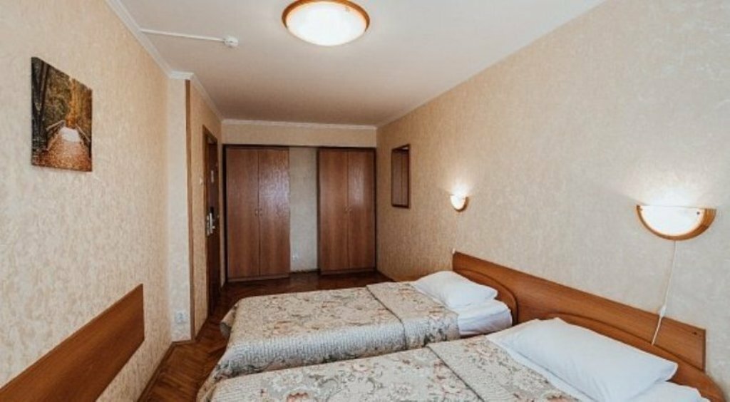 Комната – от 14 м2, коридор – 2 м2, с/у – 3 м2.В номере: 2 раздельные кровати 90х200, прикроватные тумбочки, платяной шкаф, холодильник, письменный стол, 2 стула, плазменный телевизор, освещение потолочное и бра.