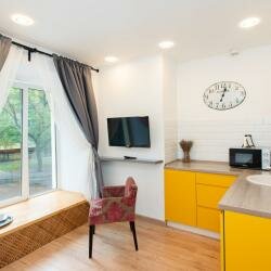Вполне приличные апартаменты, в развитом районе. Рядом имеются продуктовые магазины, в самом доме есть универмаг, недалеко Пятерочка. Метро Кунцевская относительно недалеко. В номере есть чай, кофе в саше в чашку, сахар, ну и комары) Есть и недостатки, вроде отваливающейся ручки в санузел, но совсем не критичные. Ну и завтрак, на любителя — всё в заморозке, после микроволновки представляет собой безвкусную резину, но опять же, по моему мнению, может кому и понравиться. А в целом, апартаменты удобные, правда лучше брать с собой телефон, если выходишь в холл, а то не вспомнишь пароль от кодового замка и придется искать местный персонал, которого не видно. В общем рекомендую, отель стоит своих денег!