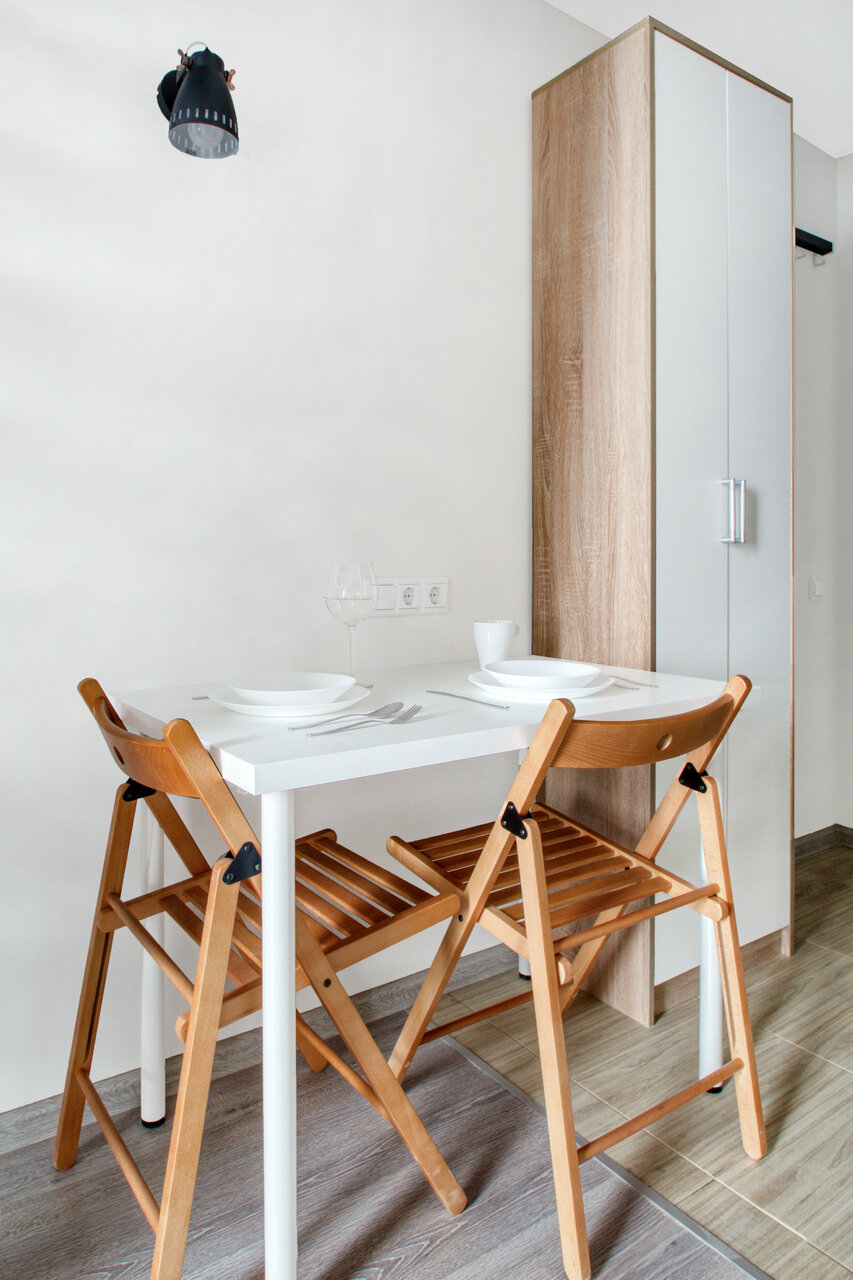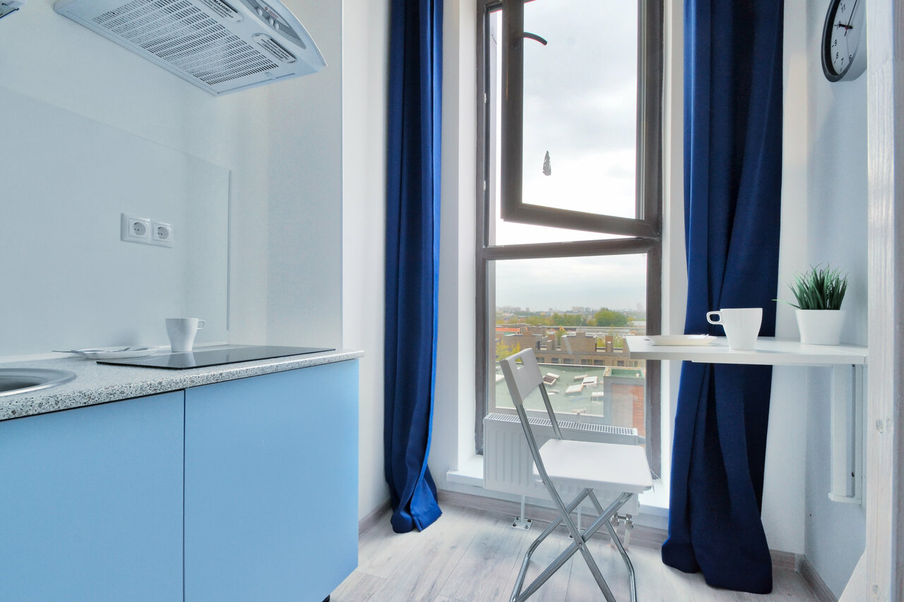 Студия уютная со всем что нужно для комфортного проживания. Всё красиво оформлено, в светлых цветах что придаёт больше света всему помещению. Отдельно понравилась большая мягкая кровать с отличным пастельным бельём.