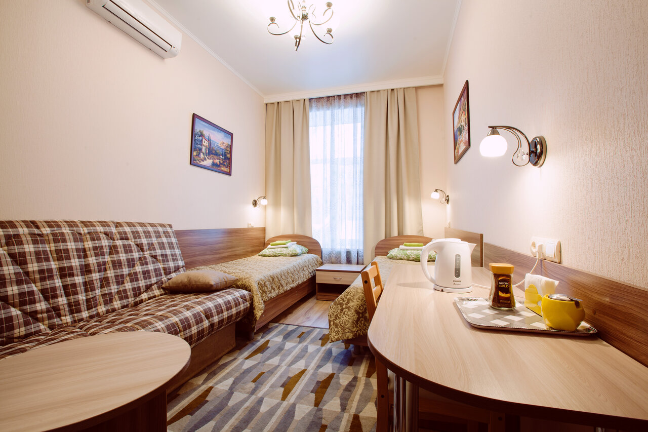 Небольшой номер, но все необходимое есть(чайник, кружки, фен. Кухня~столовая общая, но это не критично. Приятно порадовало наличие фильтра для питьевой воды, а также возможность оставить чемоданы до заселения и после выезда на некоторое время. Расположение-просто :минут 10-15 неспешным шагом до ГУМа, Красной площади,, рядом метро, остановка , огромное количество магазинов и кафе. Место отличное, рекомендую))