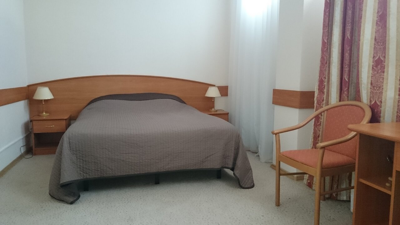 30 м2 Наполнение: двуспальная кровать, прикроватные тумбочки, стол, два стула, раздвижное кресло, шкаф для одежды, телевизор, холодильник, кондиционерДушевая в номере.