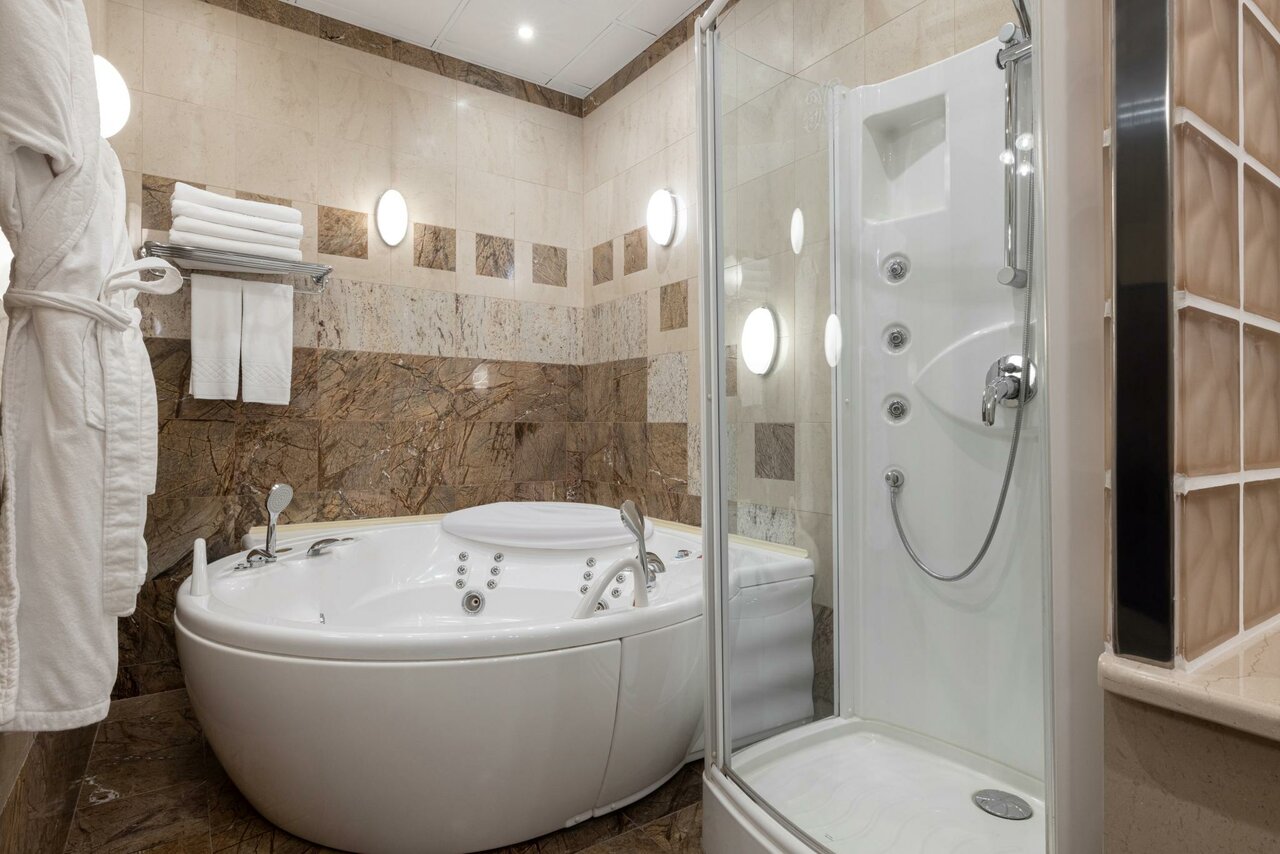В целом -хороший отель, но на твердую четверку. Расположение ,завтраки, обслуживающий персонал-все отлично, но не номера. Кто-то в отзывах пишет : ‘атмосферные номера’,’ в стиле СССР’, но они просто требуют ремонта! все шнуры закручены вокруг ножек стола ,с переносками повсюду! Чтобы включить торшер, нужно поискать его включатель под столом, под диваном .. . Джакузи(кстати ,не понимаю,как люди постарше могут принять душ, сумев перешагнуть через очень высокий бортик ) ‘убиты’ — шланг не держится ,нужно держать его в руках,плохая гидроизоляция,что видно сразу,а мне еще удалось увидеть ,что такое повсеместно, когда утром начало течь на голову из номера выше ,причем в районе раковины. Пришел мастер,сказал,что ничего не сделаешь,вода должна стечь . Самостоятельно пришлось бросить все полотенца на пол, каким то образом уворачиваясь от течи, умыться. Хорошо, что нужно было уходить. В отеле 5 звезд извинились бы за это , комплимент какой — то сделали бы обязательно ,здесь — убрали только .