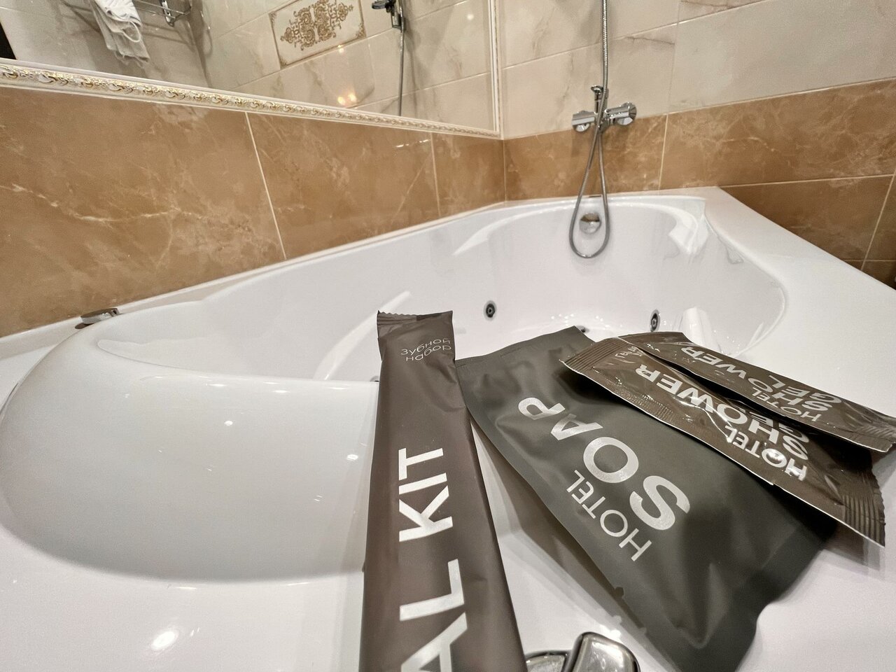 Невероятно уютный Де Люкс, в нем есть все для комфортного проживания: широкая двуспальная кровать со свежим и выглаженным бельем, большой ЖК телевизор со спутниковым ТВ, личный холодильник, чайник. В ванной комнате вас встретит гидромассажная ванна