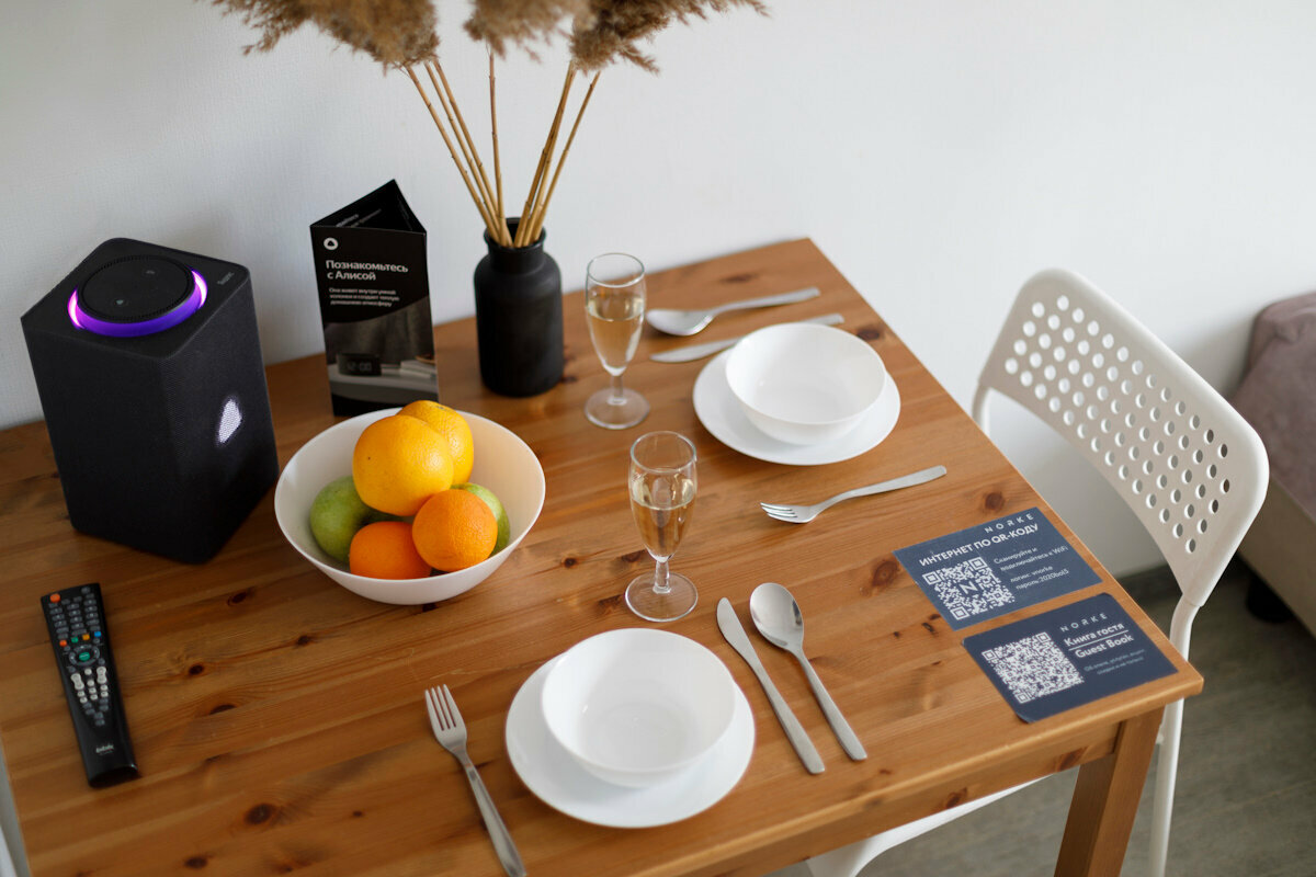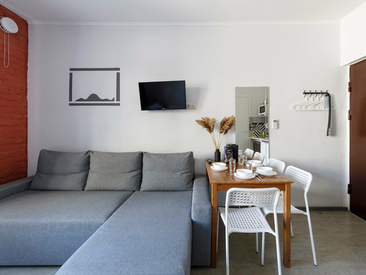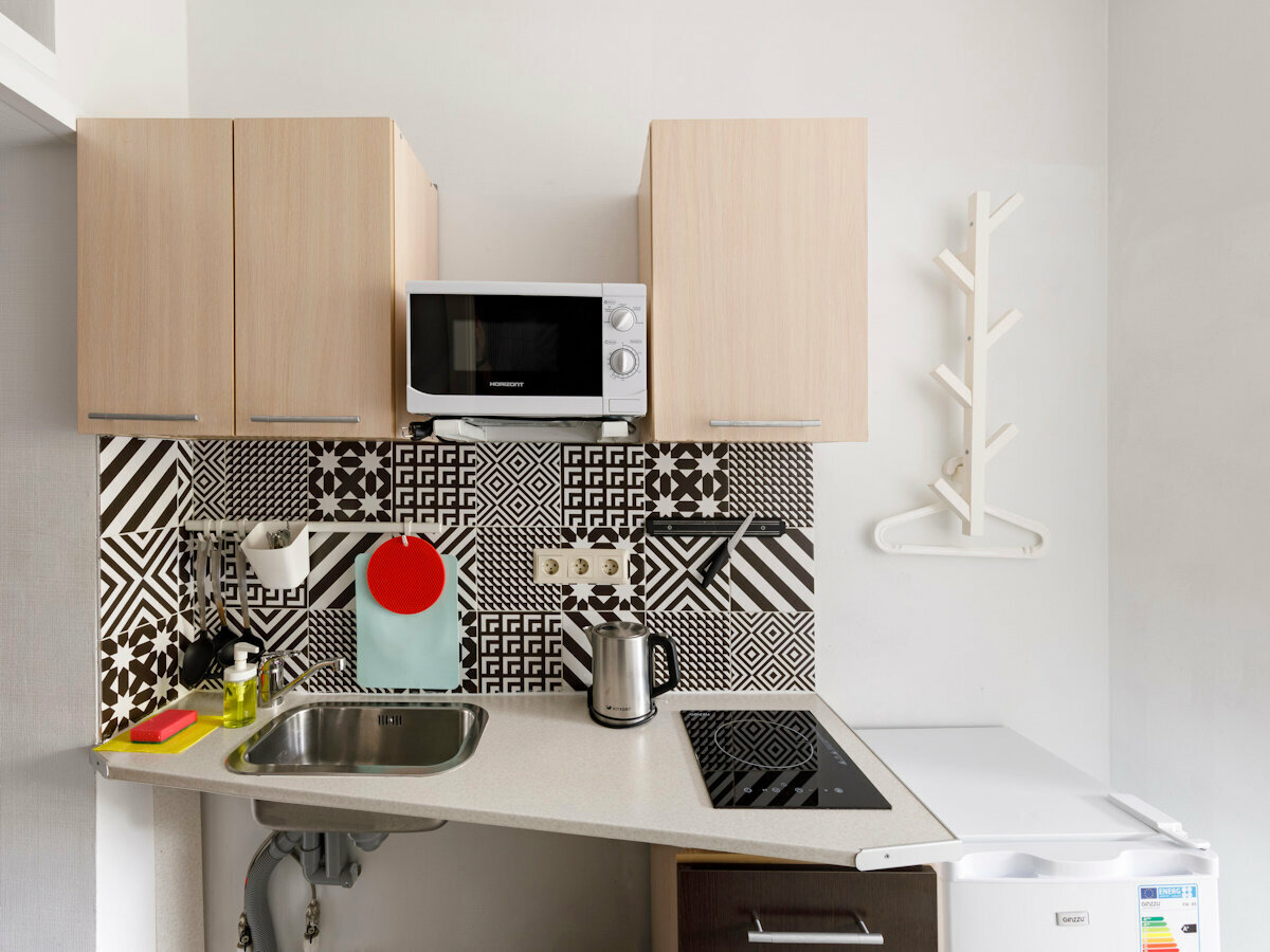 Расположение отеля в нескольких минутах от Казанского вокзала. Номер в целом понравился, относительно чистый, есть 5 полотенец и две пары одноразовых тапочек, плита , посуда, электрочайник, кофе, чай, сахар, но подъезд очень неудобный, а также расположение номера между этажами. Пришлось поднимать тяжёлый чемодан по лестницам. Администраторонлайн, что тоже не совсем удобно, если приехал издалека и нет времени разбираться с онлайн- заселением, особенно если не работает интернет или работает плохо. Продление брони также не продумано. Бронь продлили, а по факту получилось повторное заселение. В 12.00 сменился код и хорошо, что я была в номере, иначе не смогла бы попасть 2 часа в комнату со своими вещами. Вытяжка вообще не выключается, мешает спать. В ванной комнате периодически появляется запах канализации из стока в полу. Приятным бонусом была колонка Алиса.