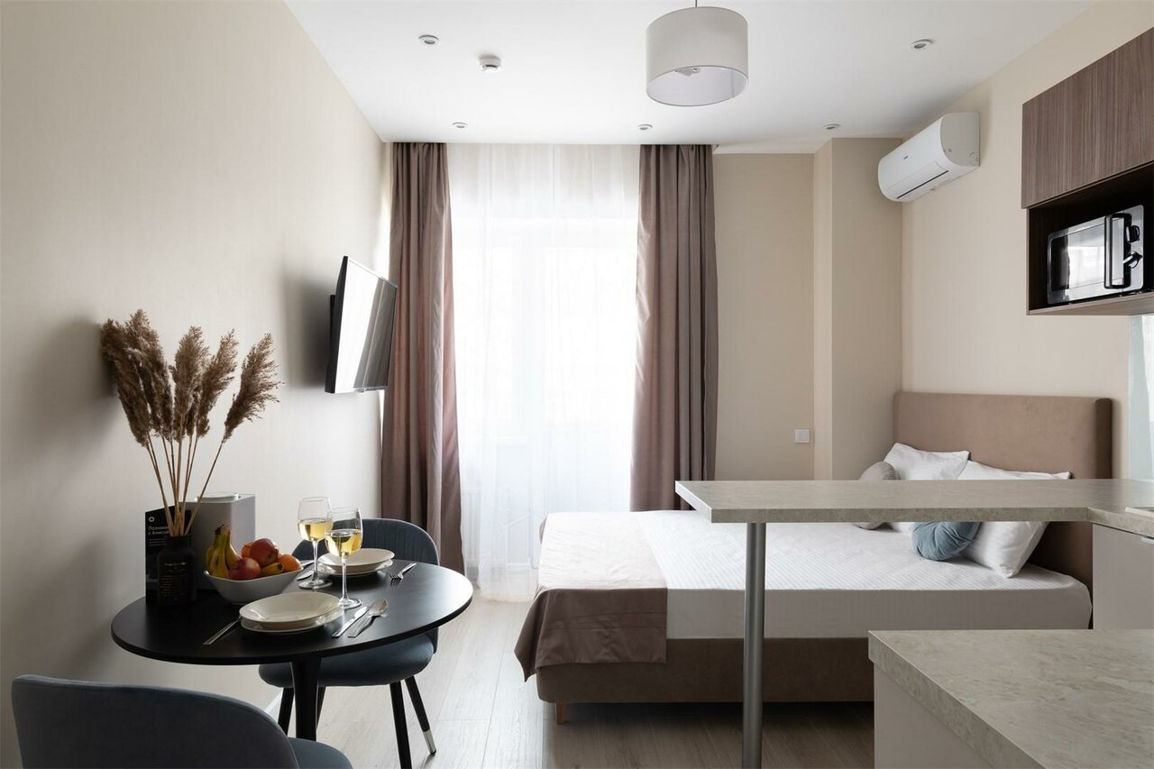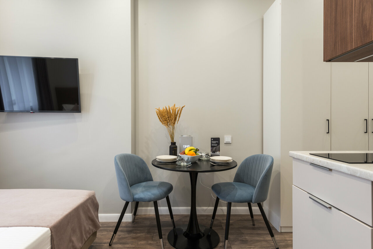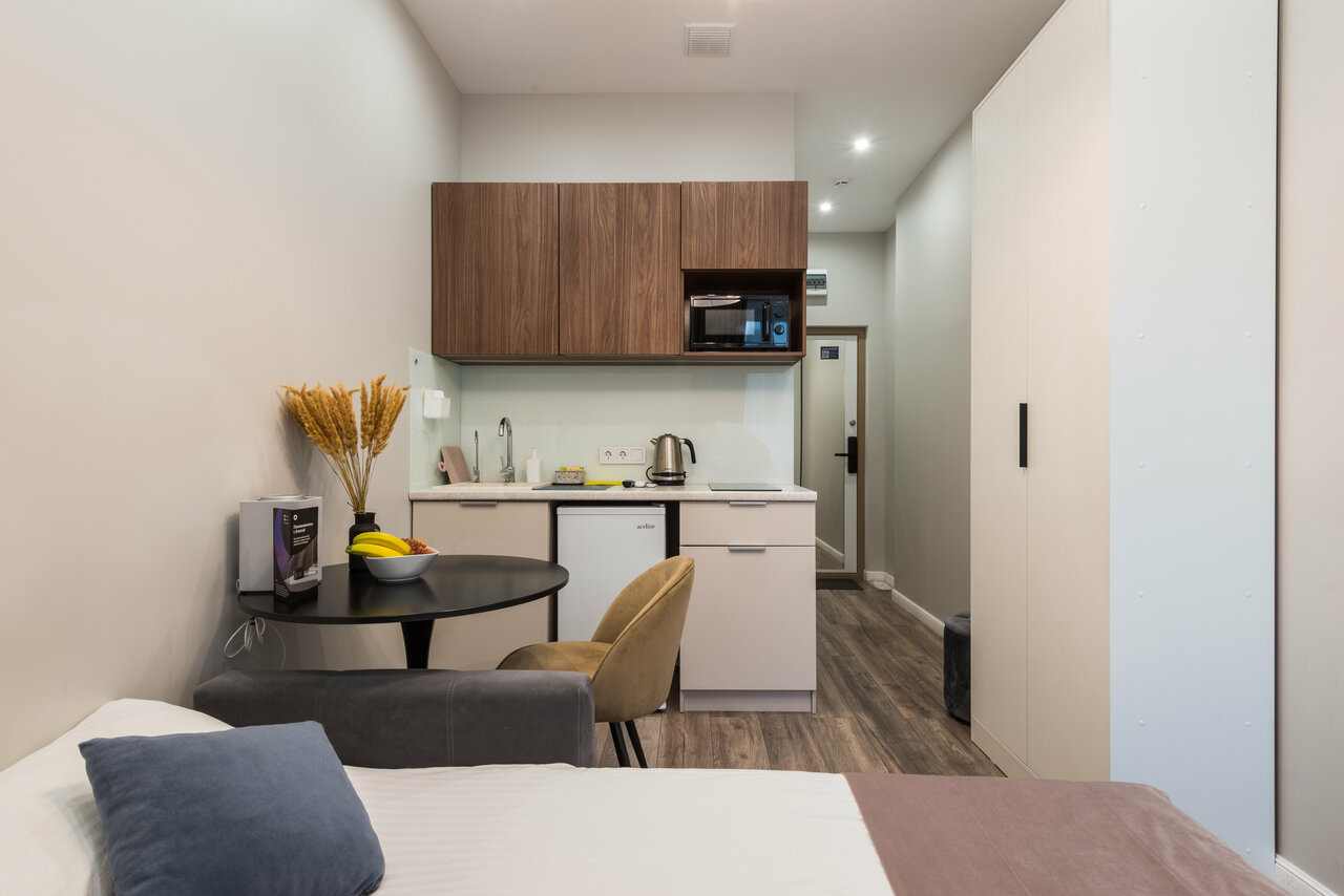 Заказывали номер класса studio. Все было замечательно. Номер аккуратный и чистый, все, что нам было нужно, было под рукой. Наличие собственной кухни — огромный плюс (в номере был чайник, микроволновая печь, варочная панель, кофемашина, необходимое количество посуды). Заселение и общение происходило дистанционно, что для меня было тоже очень удобно. Расположение соответствовало цели поездки — 10 минут до ЦДП. Метро тоже совсем рядом.