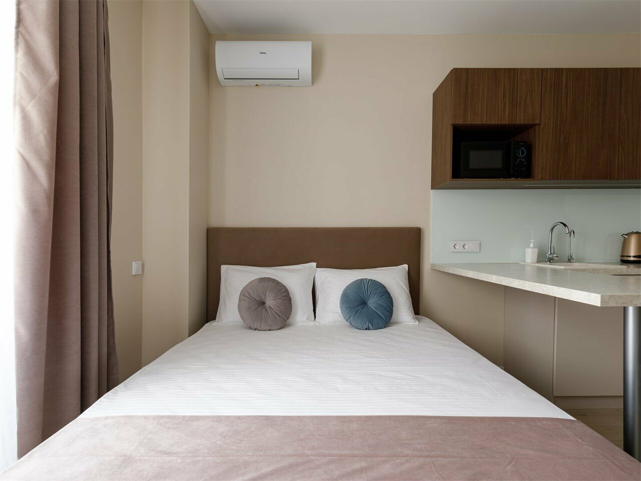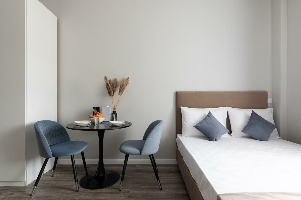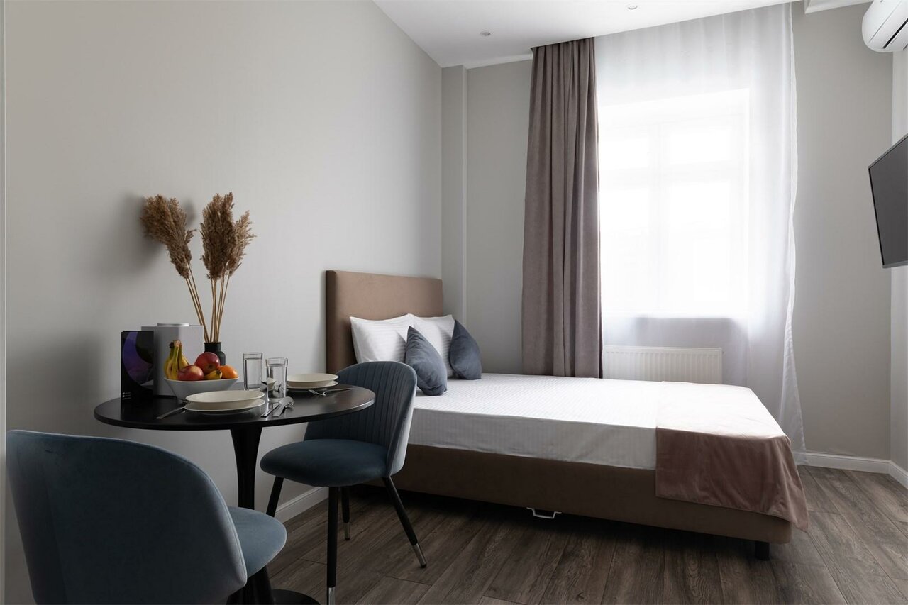 Заказывали номер класса studio. Все было замечательно. Номер аккуратный и чистый, все, что нам было нужно, было под рукой. Наличие собственной кухни — огромный плюс (в номере был чайник, микроволновая печь, варочная панель, кофемашина, необходимое количество посуды). Заселение и общение происходило дистанционно, что для меня было тоже очень удобно. Расположение соответствовало цели поездки — 10 минут до ЦДП. Метро тоже совсем рядом.