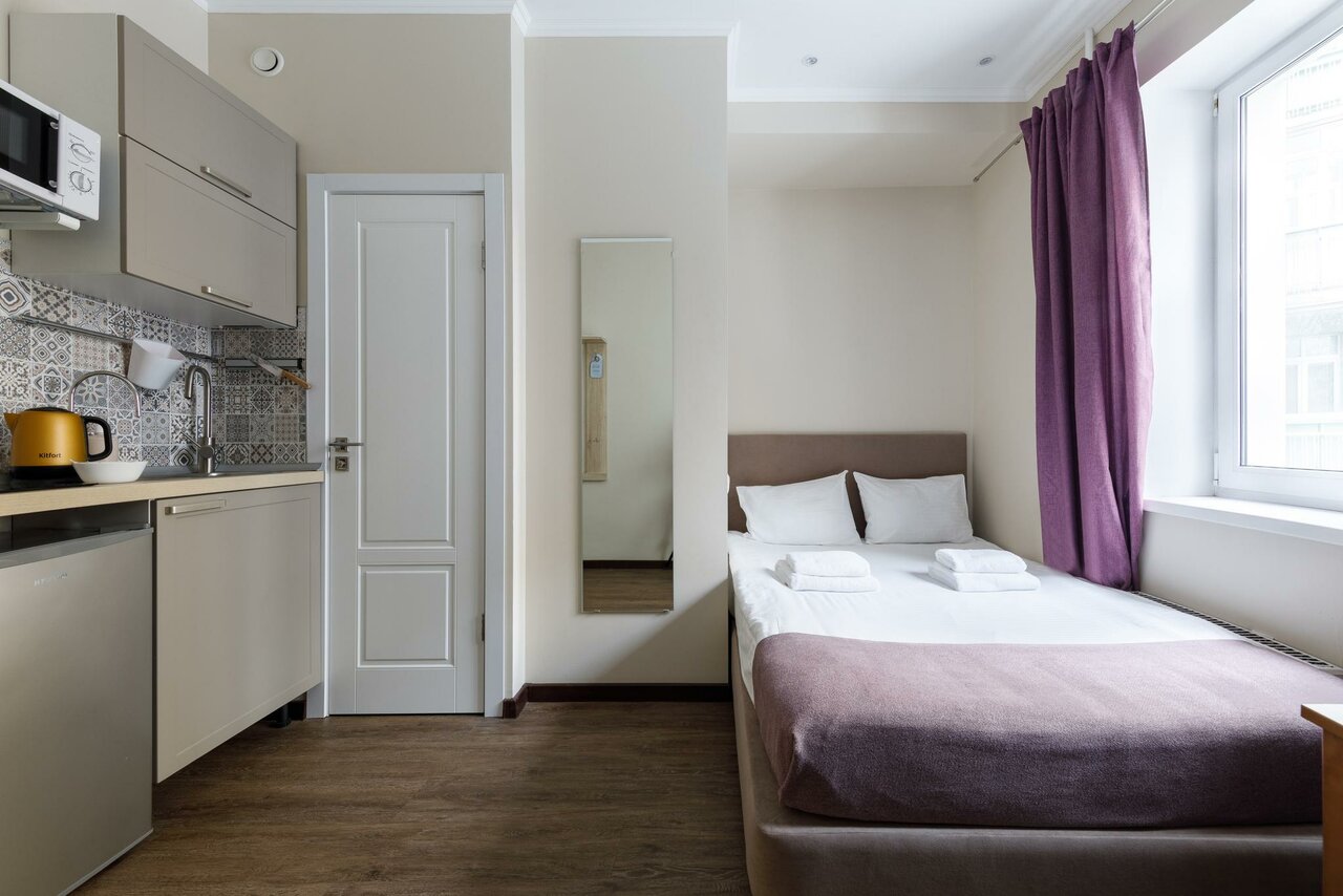 Новый, маленький, уютный отель. В тихом жилом дворе. В номере есть все необходимое и все очень чисто. На кухне есть вся необходимая посуда. Вход не с ключом, а по коду. Попросила утюг — предоставили без проблем. Даже есть фильтр встроенный с питьевой водой. Мне очень понравилось. Буду приезжать.