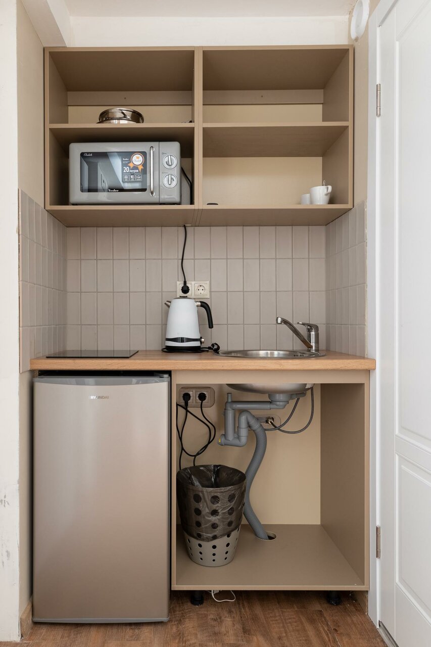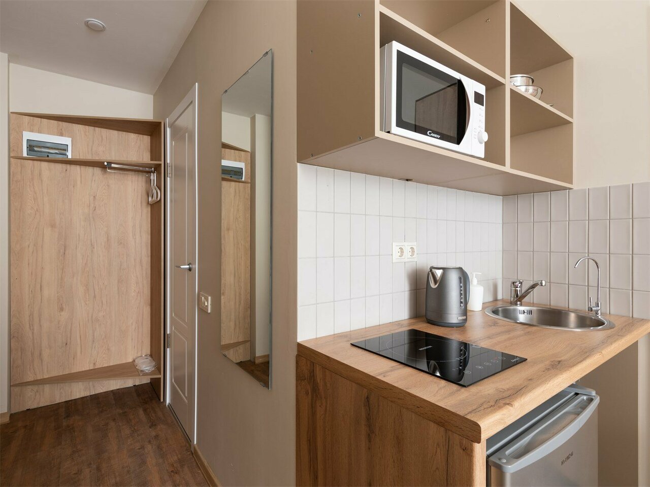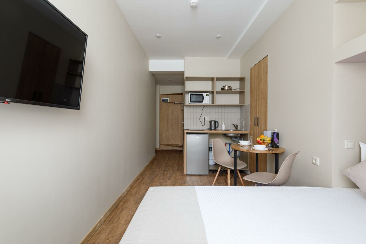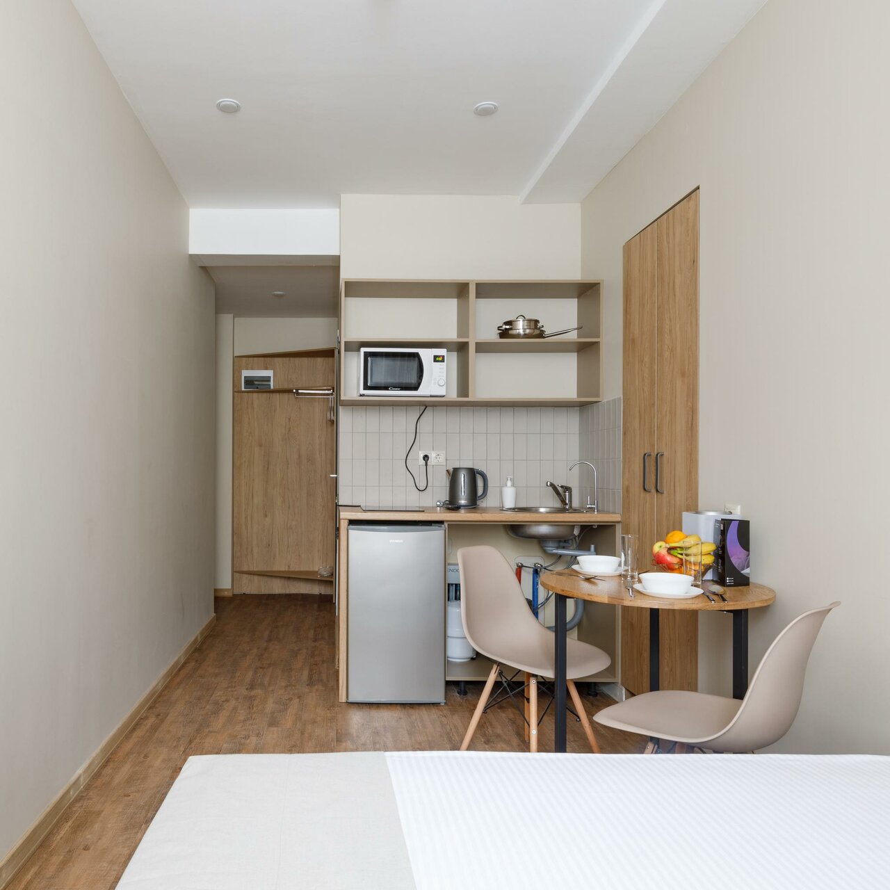 Мне в целом понравилось. Брала двух местный номер: душ, туалет, микроволновка, плита, посуда, чайник, ну и ТВ конечно) это настоящая мини студия.