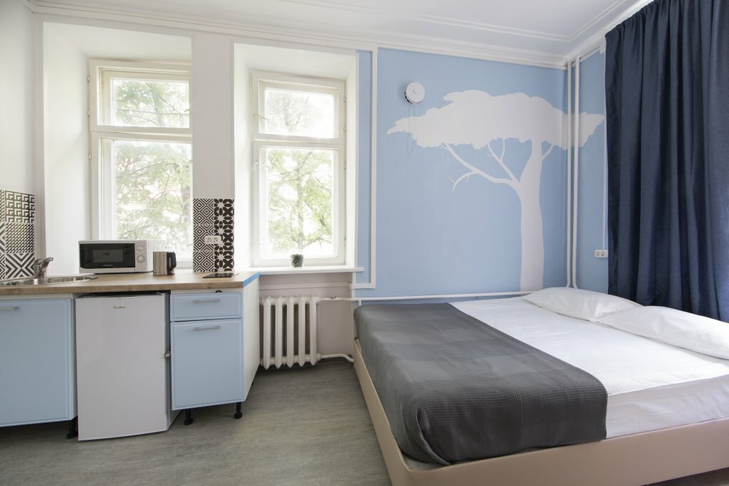 Мини кухня в номере, площадь 12 кв. м, 2 кровати 80*200 см, душ, фен, ЖК-телевизор, кондиционер, бесплатный Wi-fi. В отеле действует бесконтактное заселение по коду доступа в номер и с онлайн-регистрацией.