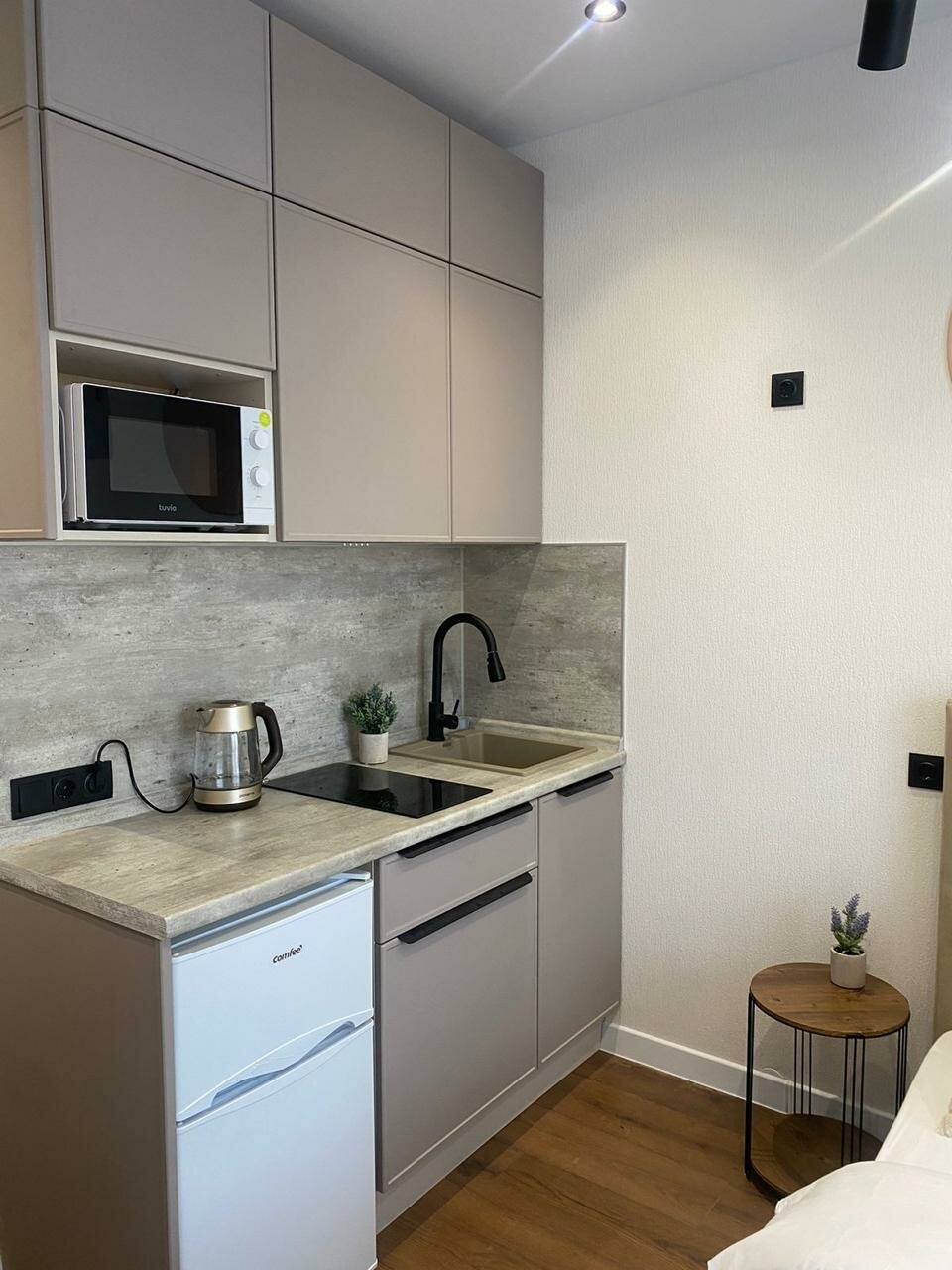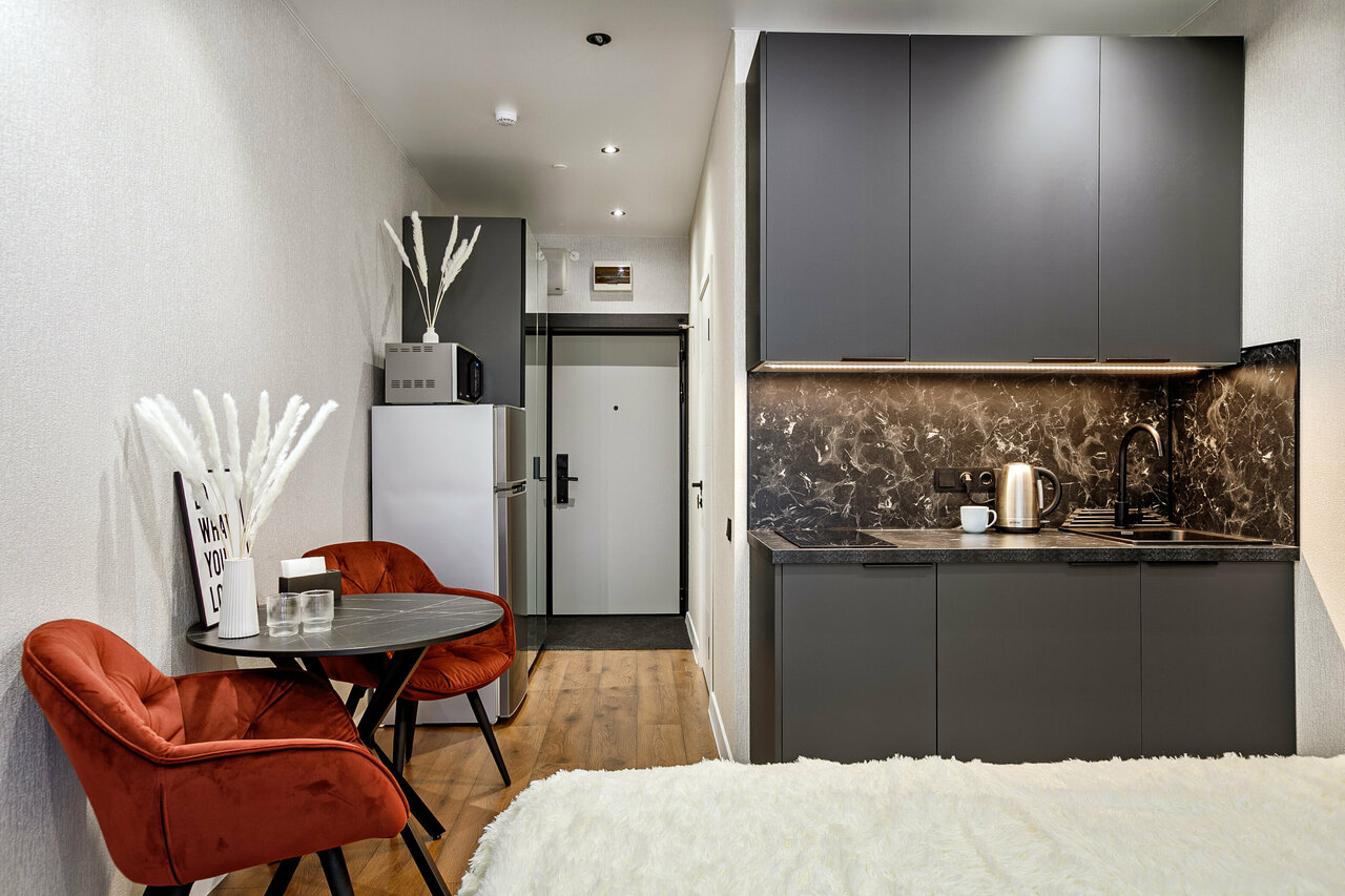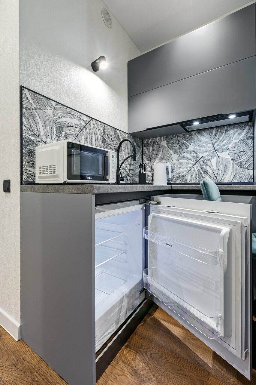 - Наличие мини-кухни с техникой (холодильник, плита, микроволновка).