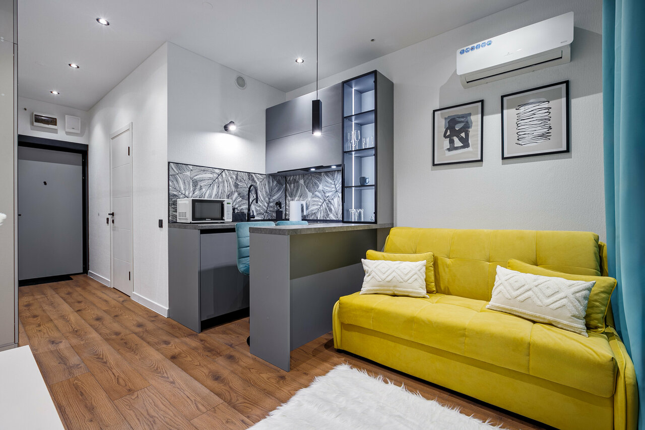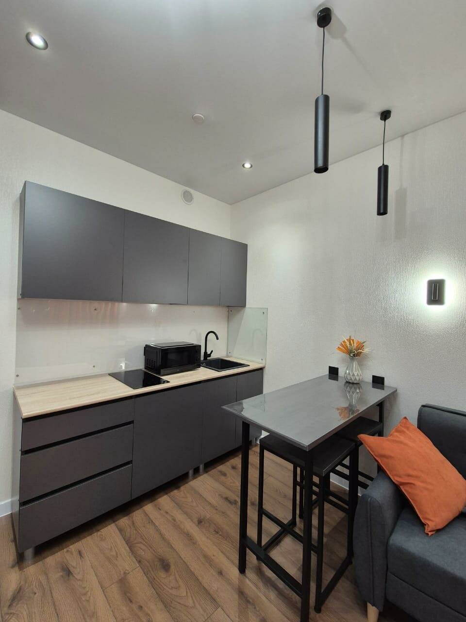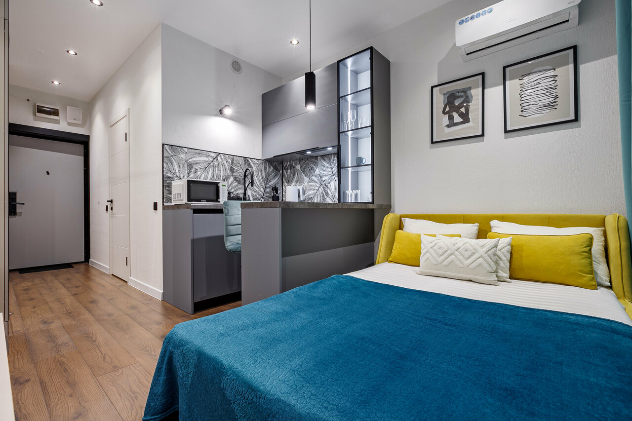 - Наличие мини-кухни с техникой (холодильник, плита, микроволновка).