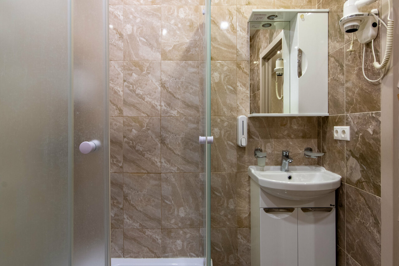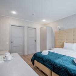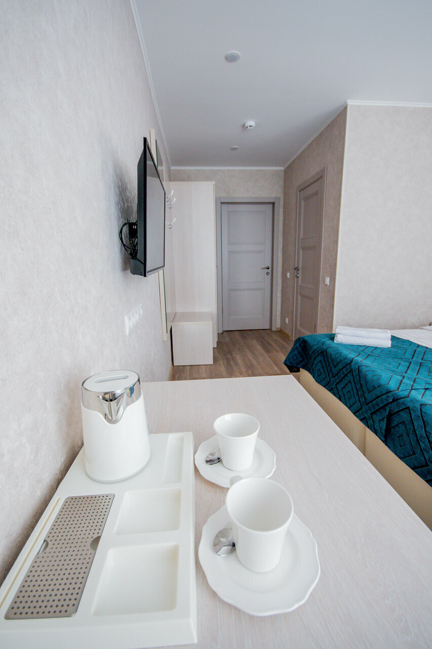 Номер комфорт-класса в мини-отеле O'Live В номере - чайная станция, санузел с душевой, гели для душа/шампунь, тапочки, белоснежное постельное белье. Возможно размещение в номерах с двумя кроватями (по запросу)