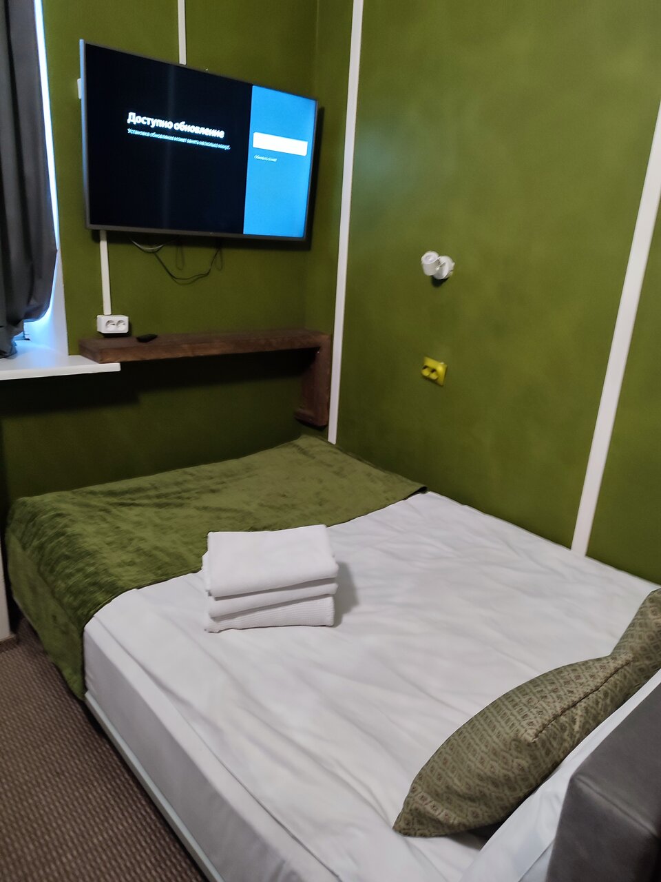 Отличное место для временного проживания. Обслуживающий персонал добрые и отзывчивые люди. Удобная кровать, есть большой телик и алиса. Холодильник есть в коридоре. Вкусный кофе.