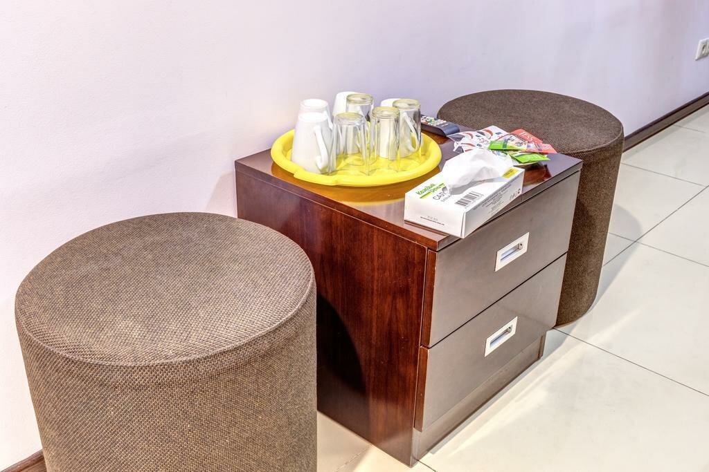 В номере- санузел- односпальная и двуспальная кровать - кондиционер- кресло- прикроватная тумба- шкаф- телевизор- Wi-Fi - зеркало;- чай/кофе/сахар/питьевая вода- тапочки- гель,шамп.,зубн.набор- губка для обуви- фен