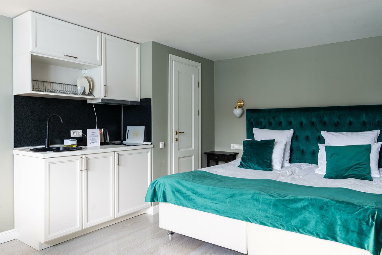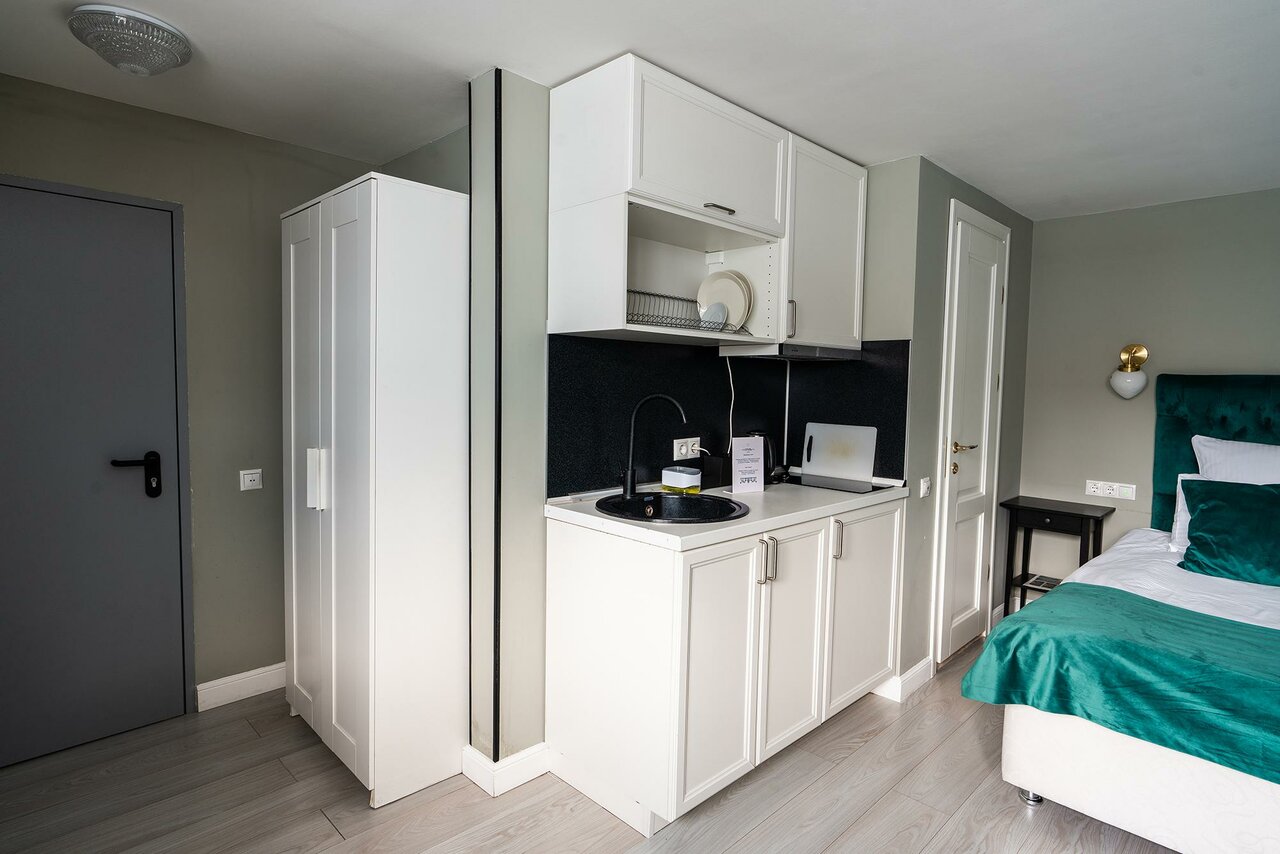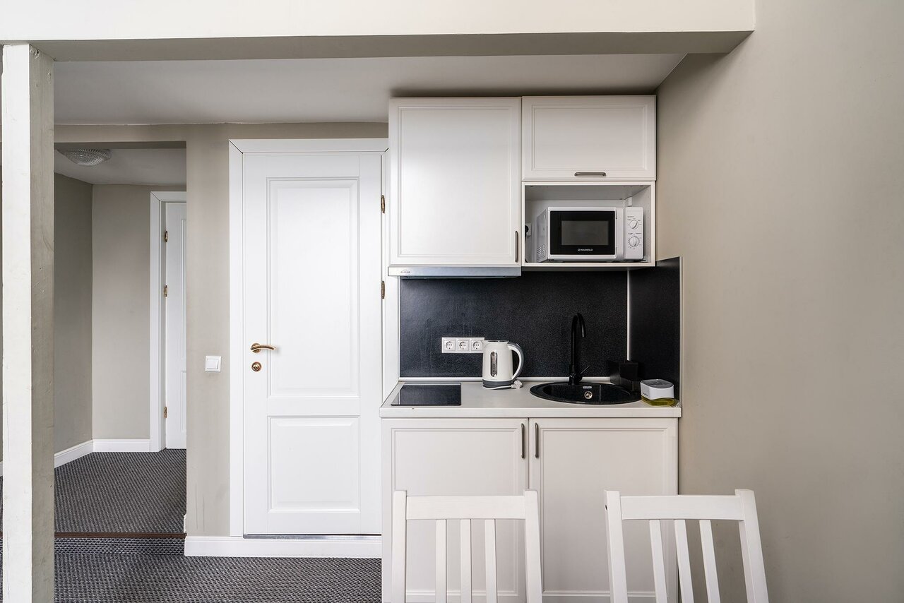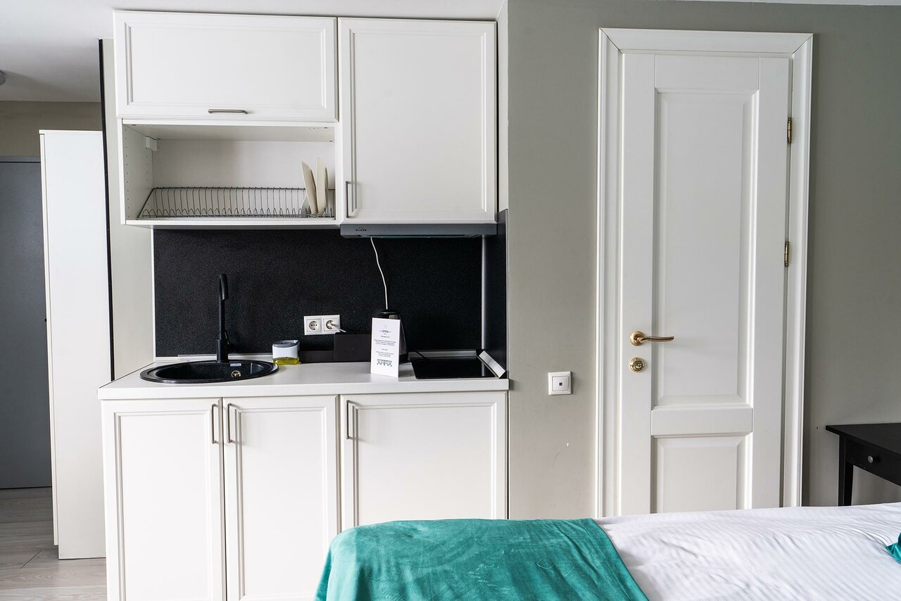 Отличный отель! Удобное расположение, совсем рядом с метро! В аппартаментах есть посуда, небольшой холодильник (с морозильной полкой), очень удобная кровать. Очень красивый дизайн номера