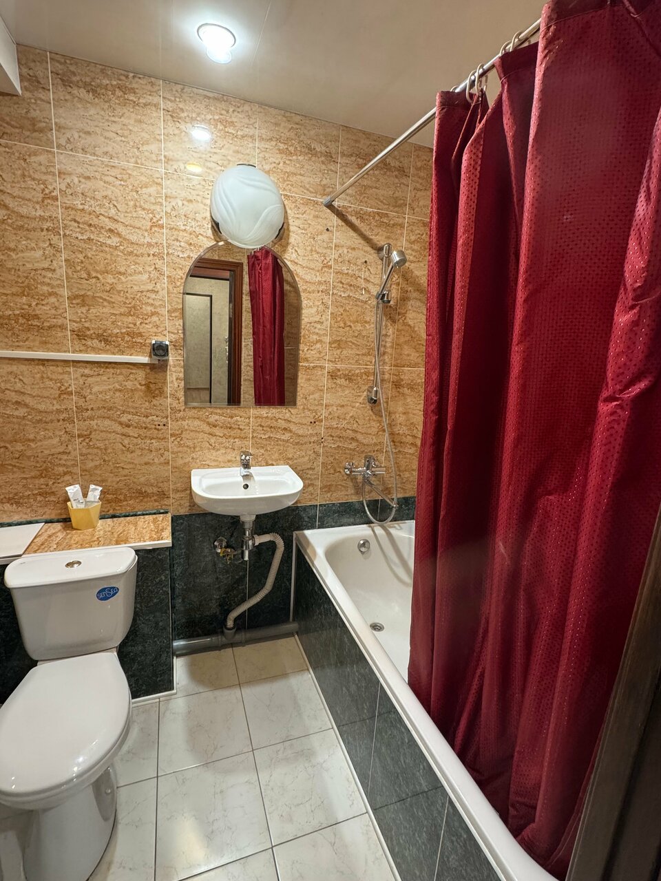Небольшой номер, но чисто, не душно. Все нужное есть: холодильник, чайник, чай, кофе, туалетные принадлежности в санузле