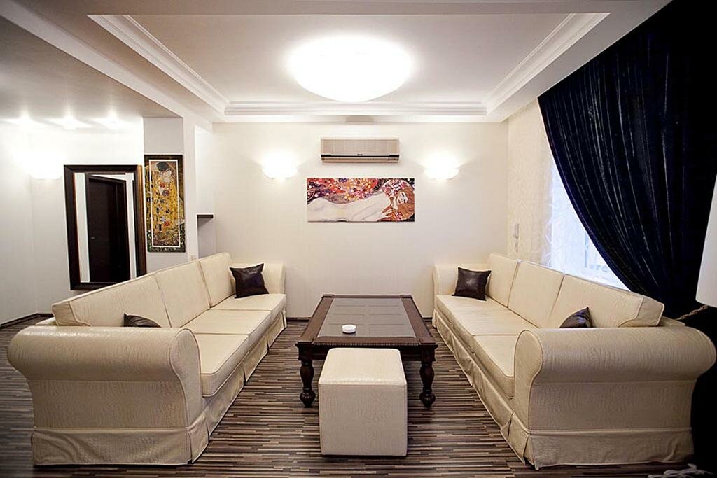 Отель только на одну ночь. Жили в люксе. В номере кроватьс матрасом, где одна сторона выше другой, 2 кресла, одно из которых порвано и оба все в огромных пятнах и столик между креслами. Это вся обстановка. В туалете рулоном с бумагой уже пользовались и оставили нам немного. Лежитменю ресторана с прожженой сигаретами обложкой. Вообщем это далеко не люкс. Из плюсов гостиницы — это можно забронировать номер на 12 часов и на сутки, расчет суток начинается с момента вашего заезда, круглосуточно работает ресторан.