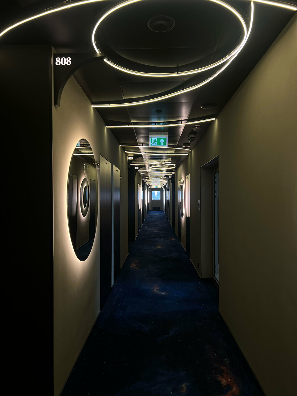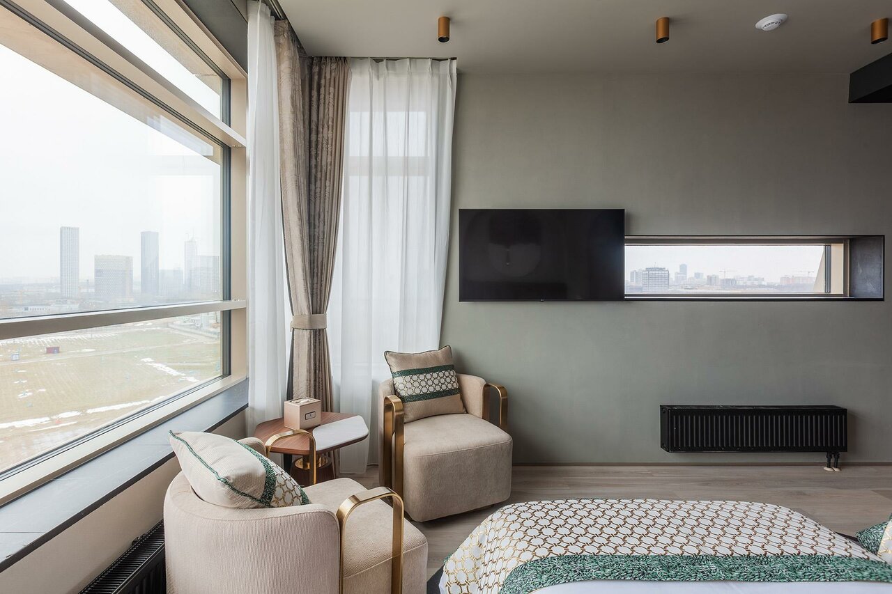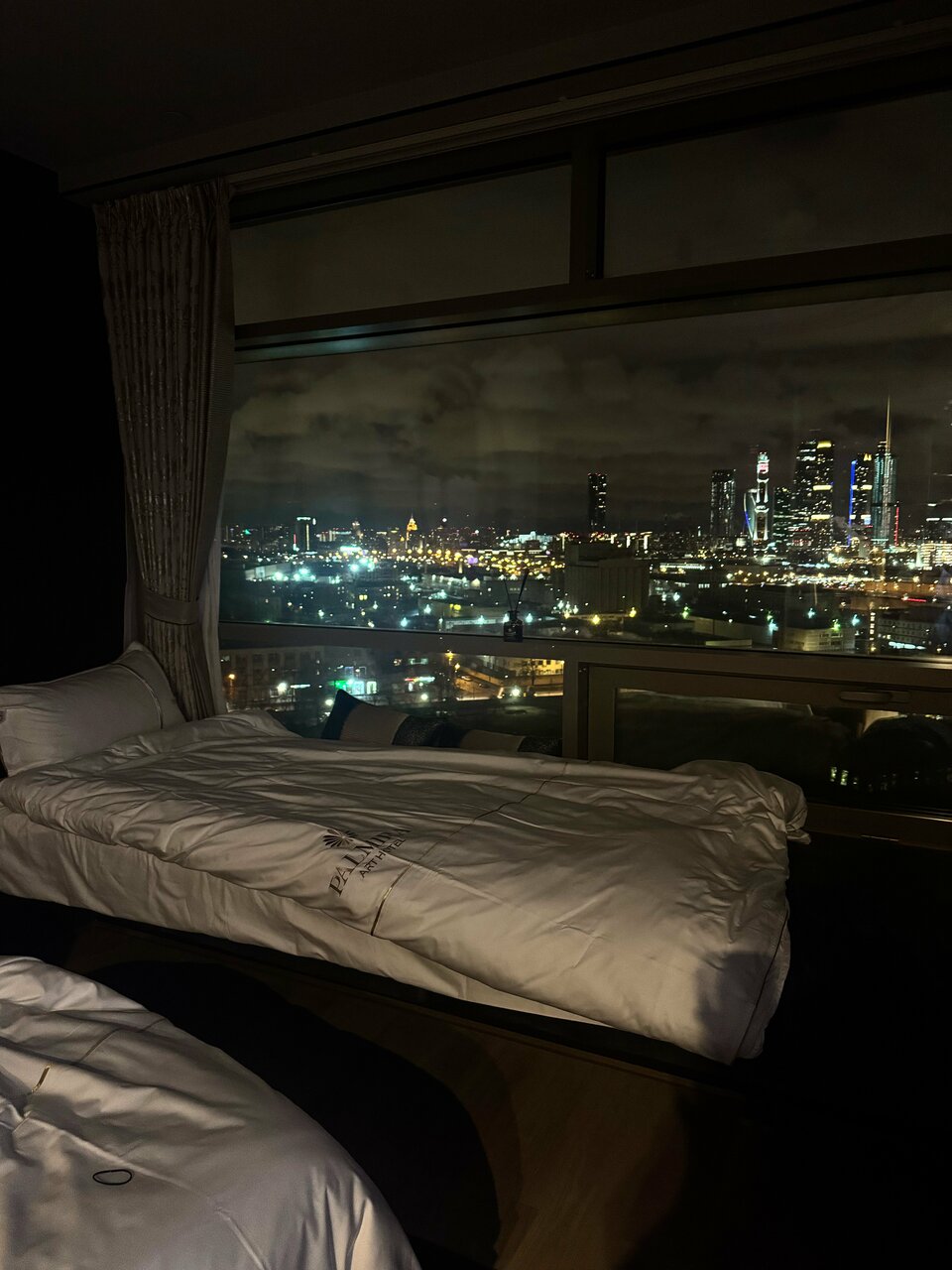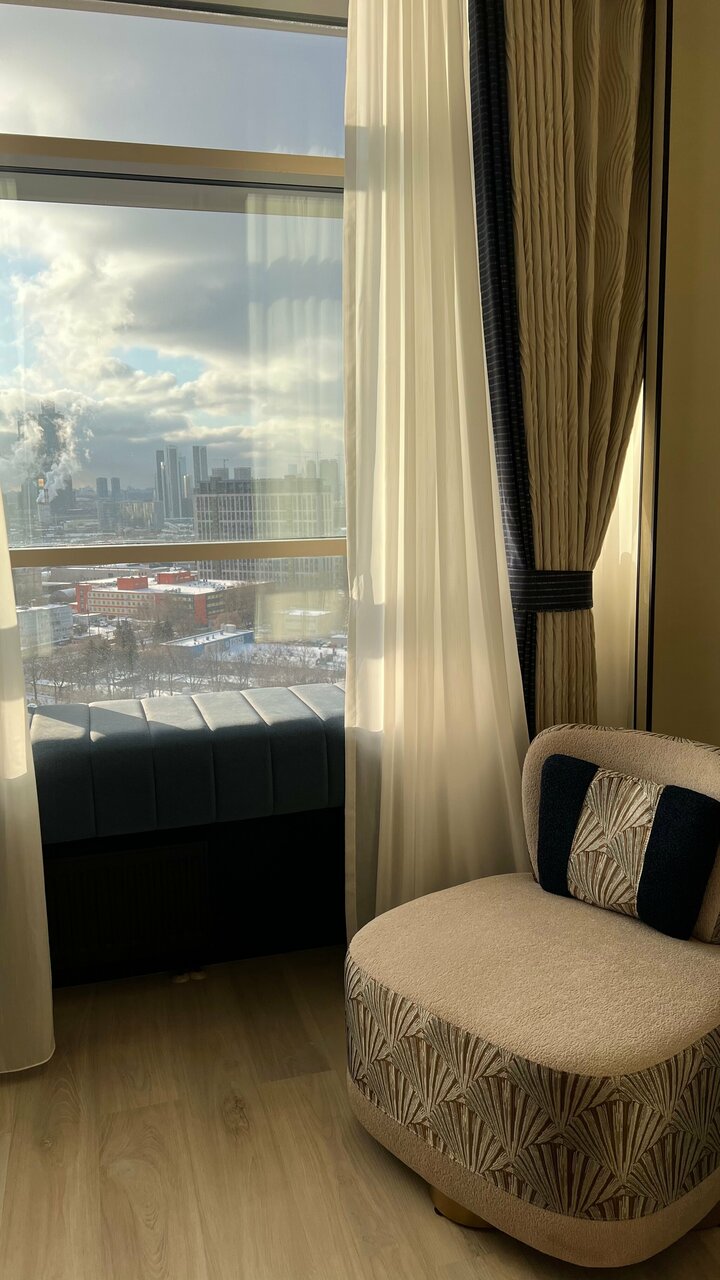 Отличная идея дизайна пространств от стойки до номера. Шикарный ночной вид на город со стороны Сити. Новенький уютный отель с продуманными номерами, вкусный наполненный завтрак с бокалом игристого, доброжелательный персонал в ресторане, баре в лобби и на регистрации, приветливые девушки в СПА. Приехали на метро, станция Полежаевская — меньше минуты (!) от метро пешком! Нас впечатлило, спасибо!