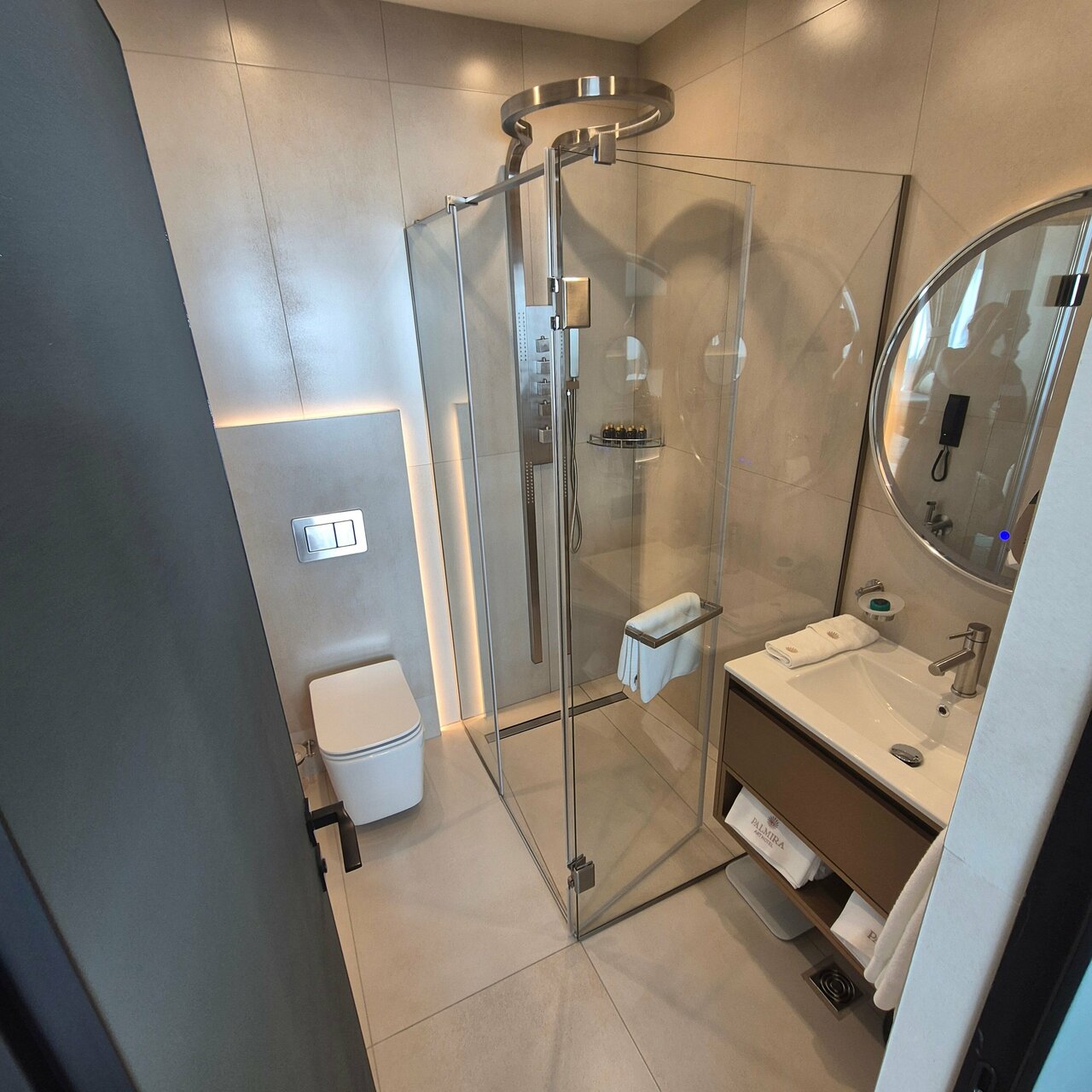 Бесплатная, большая парковка на территории отеля, приятная, чистая и красивая входная группа. Отель новый и к сожалению на момент отдыха там не был открыт тренажерный зал( Spa достаточное интересное, есть несколько видов бассейнов, но все они супер маленькие, при большом количестве народа некомфортно. У нас был Люкс — все новое, чистое, положили при заезде вкусные конфетки, сам номер большой, просторный и красивый! Когда все откроется окончательно — будет супер