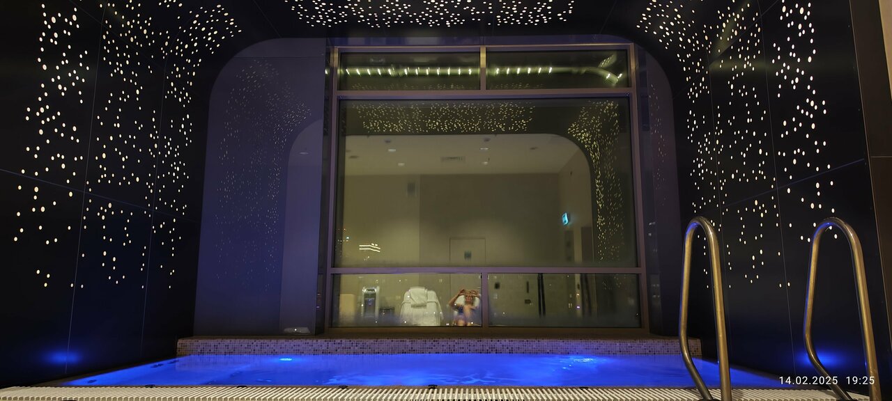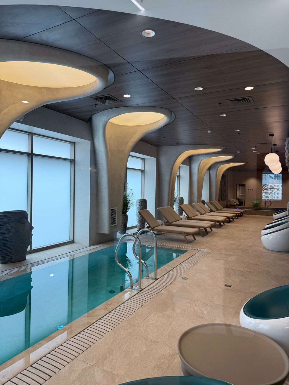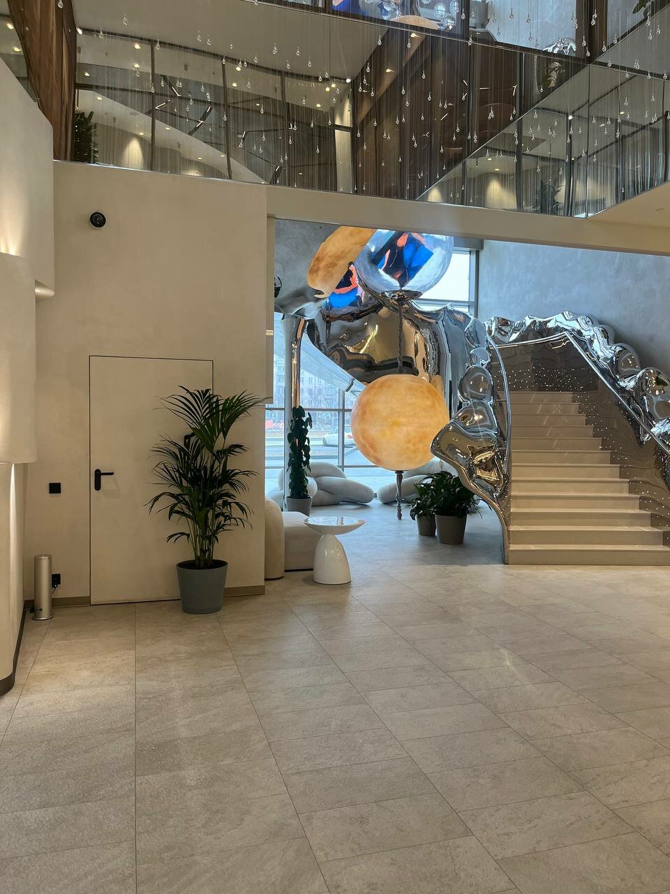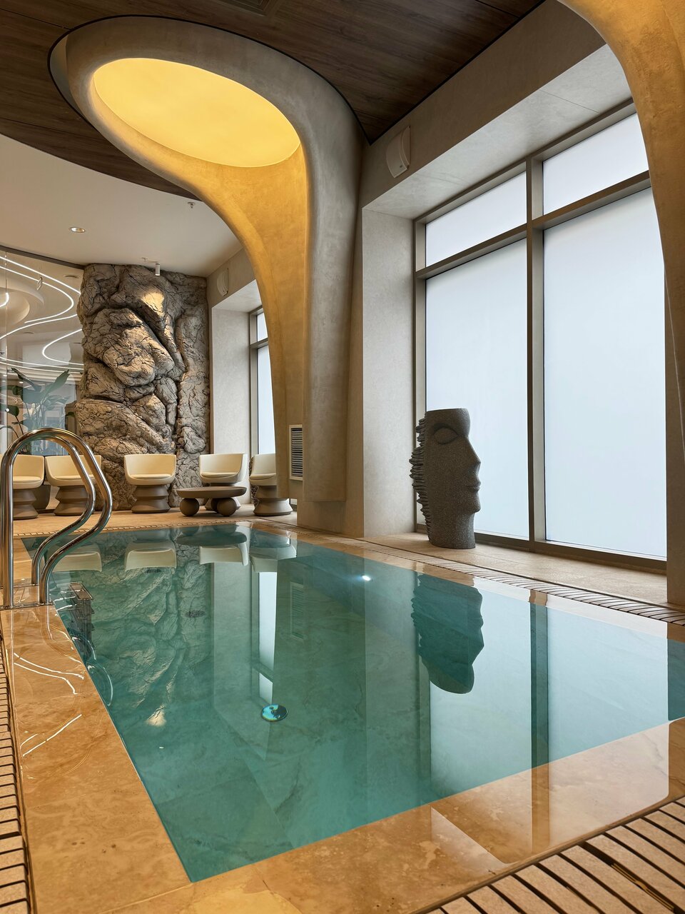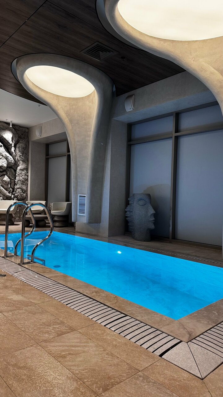 Рай для визуала! Волшебное инстаграммное пространство! Очень интересное пространство спа, с одном минусом- запах хлорки( ребята замените дез средство. Это реально портит настроение( очень внимательный персонал. Правда нас дважды заставили переезжать , так как номер по запросу был с раздельными кроватями, а нас определяли в номер с одной кроватью. И ТВ без функции смарт, без ютуб. Информация , чтоб не было неожиданностью, как для нас. Нет фитнес центра. Но потрясающий вид из окна и лестница- все сгладили.