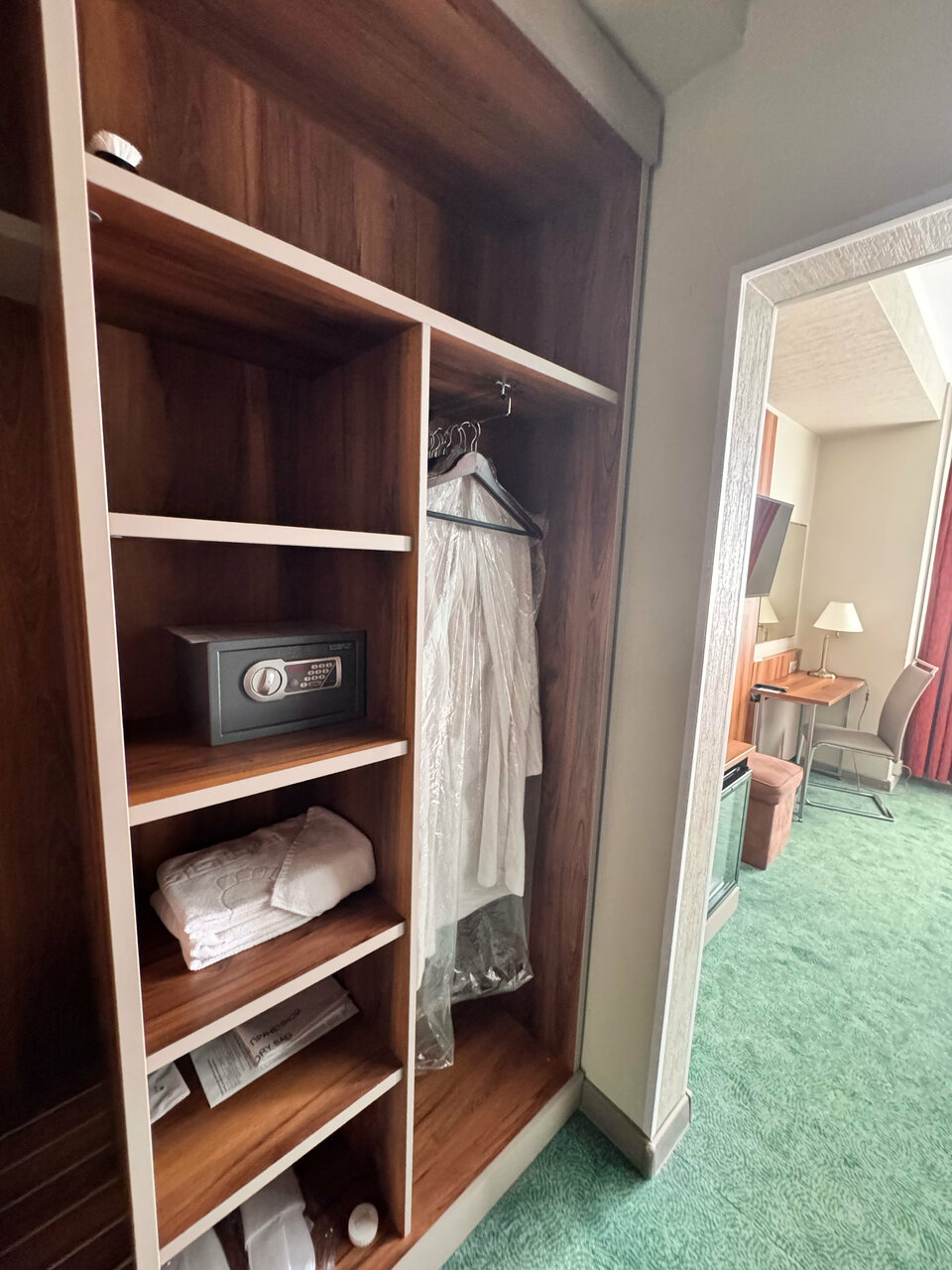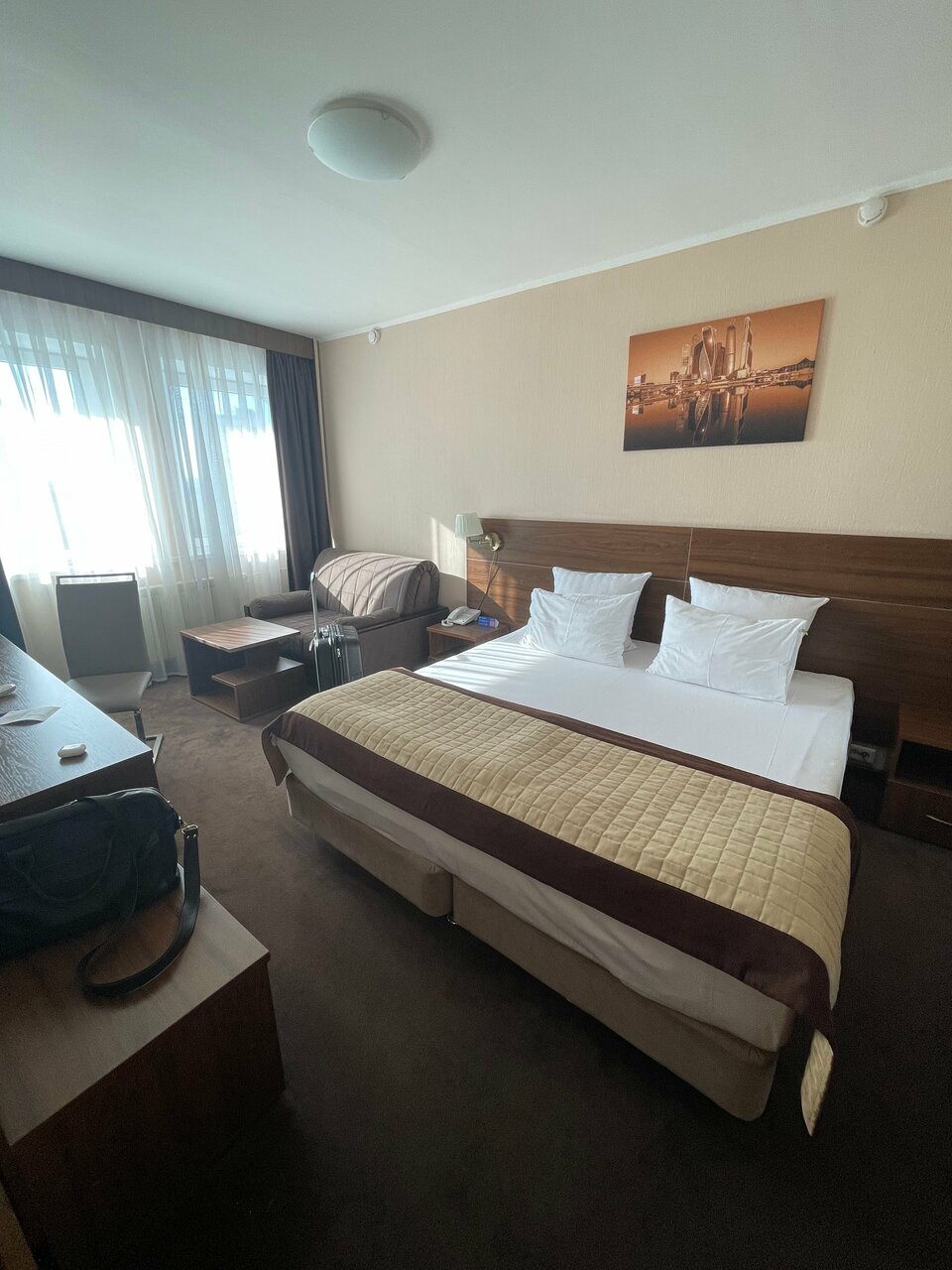 Шикарный вид из окна на 22 этаже, удобная большая кровать, пуфик, стол, кресло. Из минусов в ванной комнате местами плесень, местами слой пыли, еле пукающий фен, в целом ванная комната большая со всеми необходимыми средствами и большим зеркалом. Огорчает что горничные забивают на уборку пыли как в шкафу ( что особенно огорчило), протёрли полоску спереди, а сзади можно из пыли кокон связать, так и в местах, где якобы не видно). 4 звёзды за шикарный вид, чистую и удобную постель, отсутствие запахов затхлости, чистые полотенца. Звезду снимаю за отсутствие внимания к деталям уборки ( пыль в шкафу, особенно в таком количестве, безобразие)