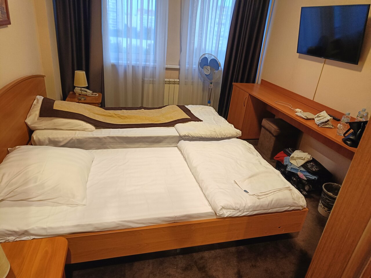 Ставлю 3 звезды, хотя по честному ноль! 1. Ресешн общается с надрывом 2. Номера грязные, старые , проженный ковер 3. Лифты — справа четные — слева нечетные — никто не предупреждает гуляли по этажам пока сориентировались 4. Уборка постучала в номер , когда я собиралась полуголая , когда сказала не надо убирать — настойчиво просила пройти в мой номер и позвонить на ресепшн сообщить об отказе 5. Ресторан вообще клиника — один раз просто не принесли блюдо, второй минут 40 ждала 6. В номере безумно жарко — контейнер не работает Из плюсов — ресепшн не гнал с выселением , за это спасибо